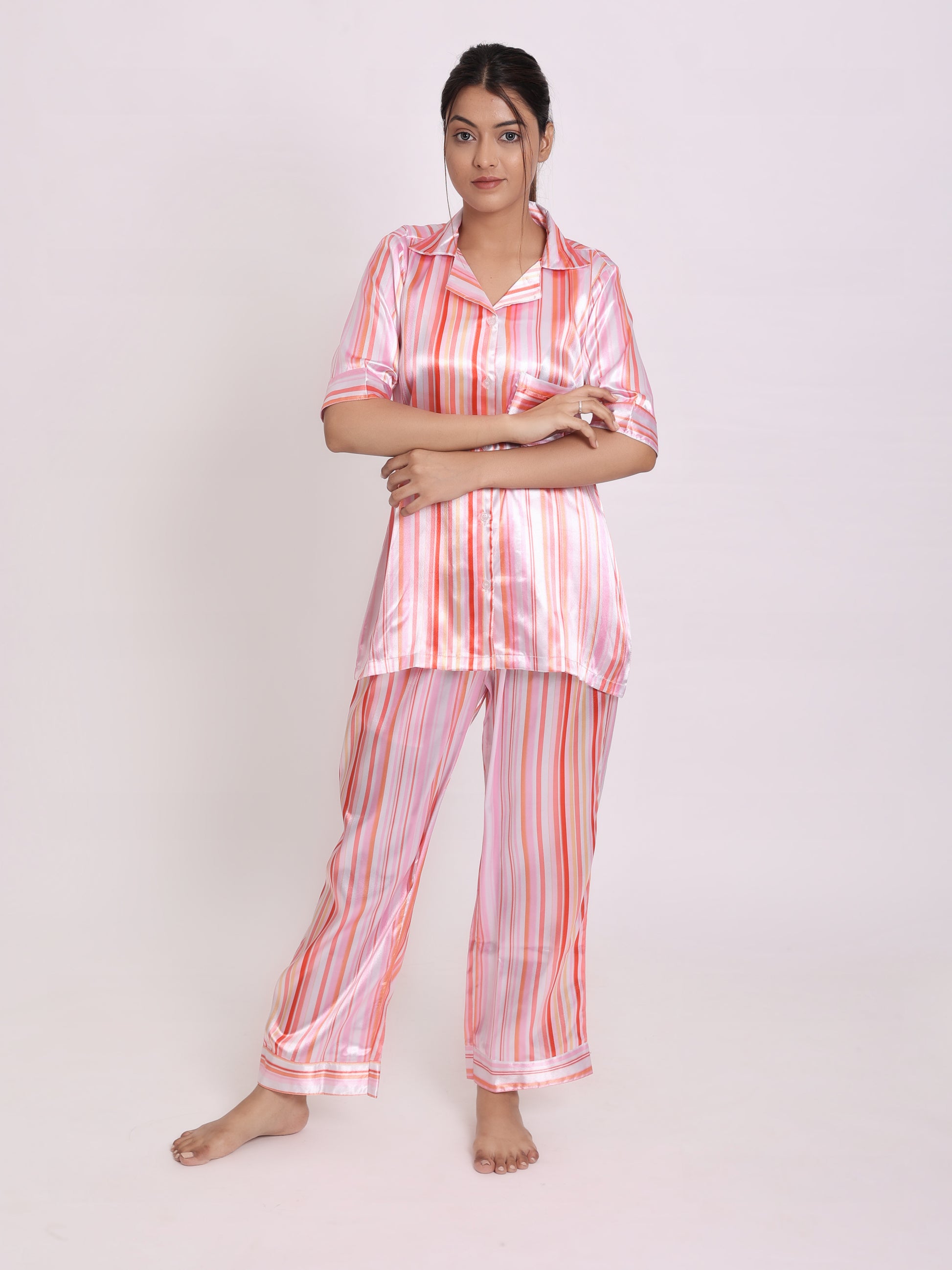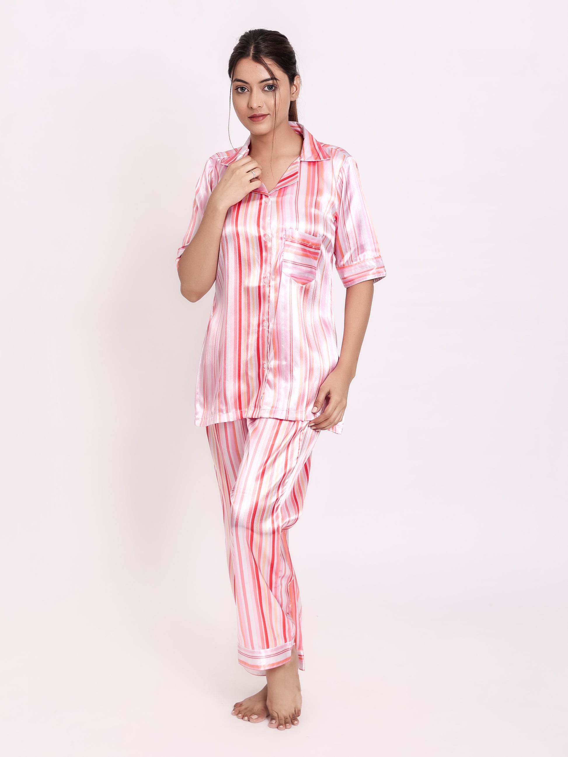 Introducing our ultra soft satin nightsuit this one is crafted with the the softest satin fabric to leave you feeling light and airy.This two-piece set features a top and bottom with a single side pocket and The top is a gorgeous short sleeves and lapel collar will further emphasise your looks.Stay cosy and comfortable throughout the night with our ultra soft satin night suits.It is a stylish and comfortable night suit.