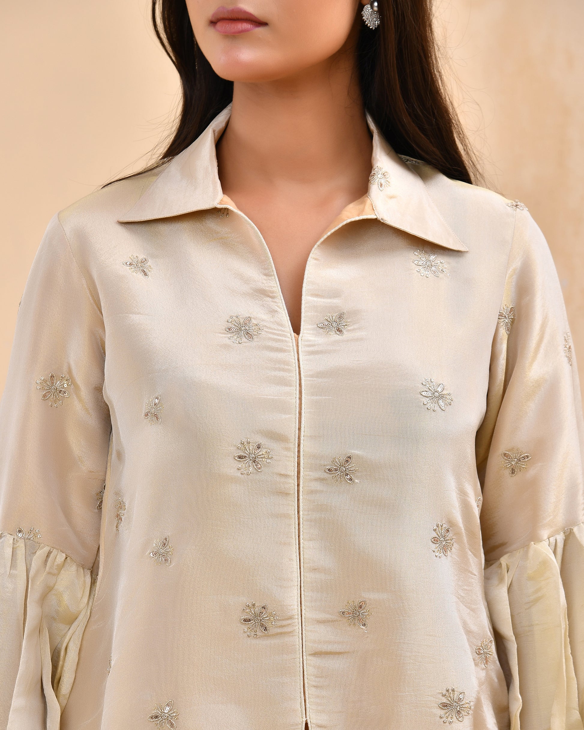 Elevate your style with this luxurious Pure Tissue Co-Ord Set, designed to bring sophistication and comfort together. A flowy, A-line shirt-style kurta crafted from pure tissue fabric, adorned with delicate all-over embroidery in subtle floral motifs.Matching straight-cut pants tailored in the same shimmering tissue fabric, giving a seamless co-ordinated look. The pants are ankle-length with a clean finish at the hem, enhancing the minimal yet luxurious appeal.