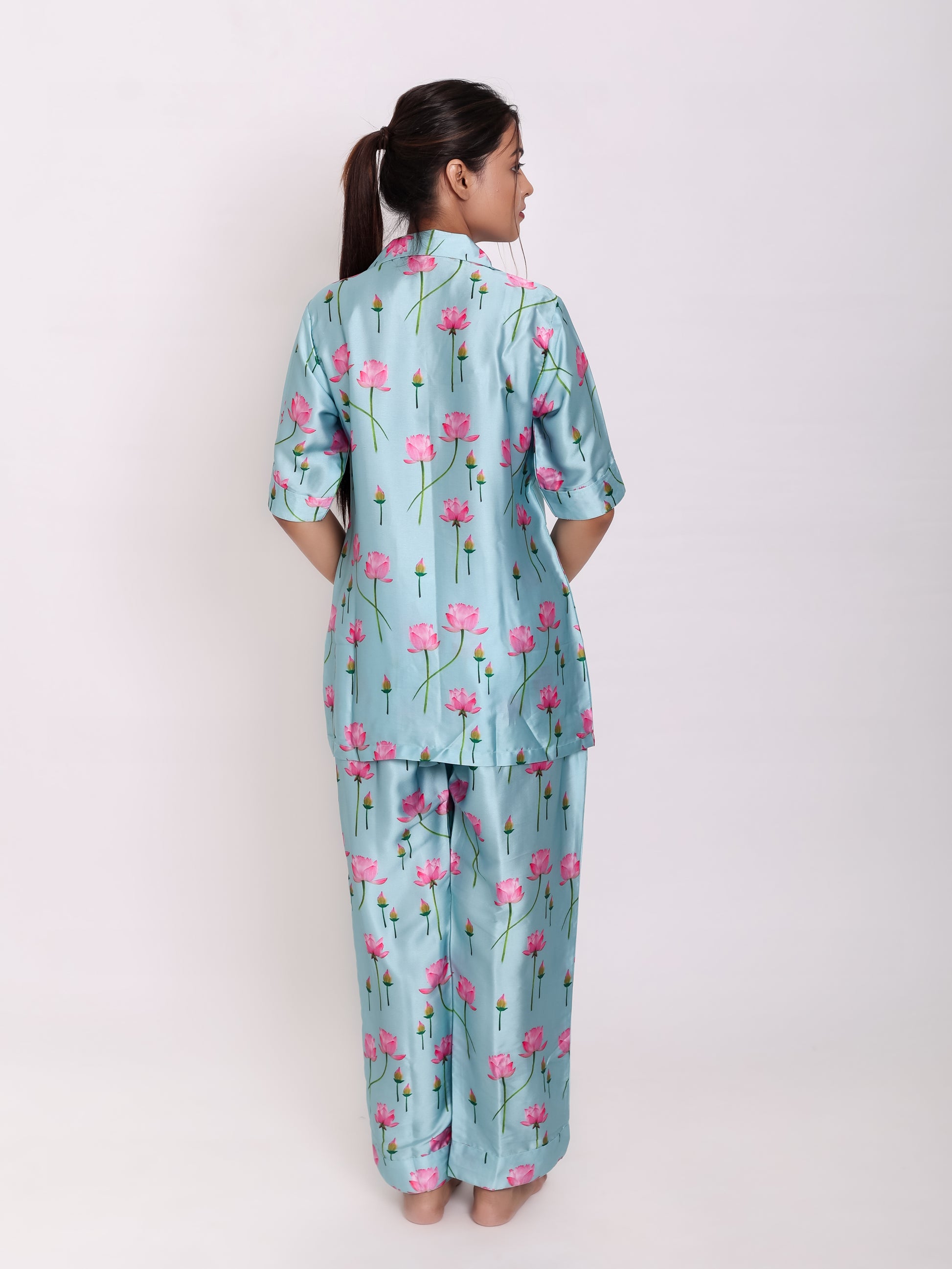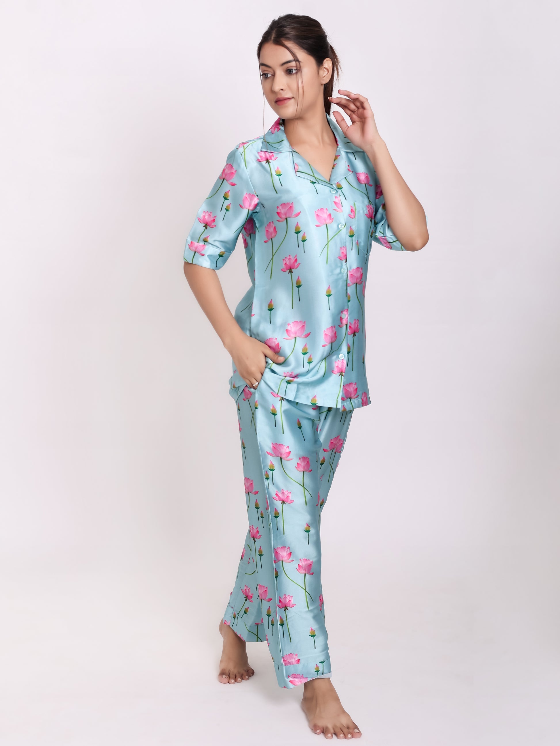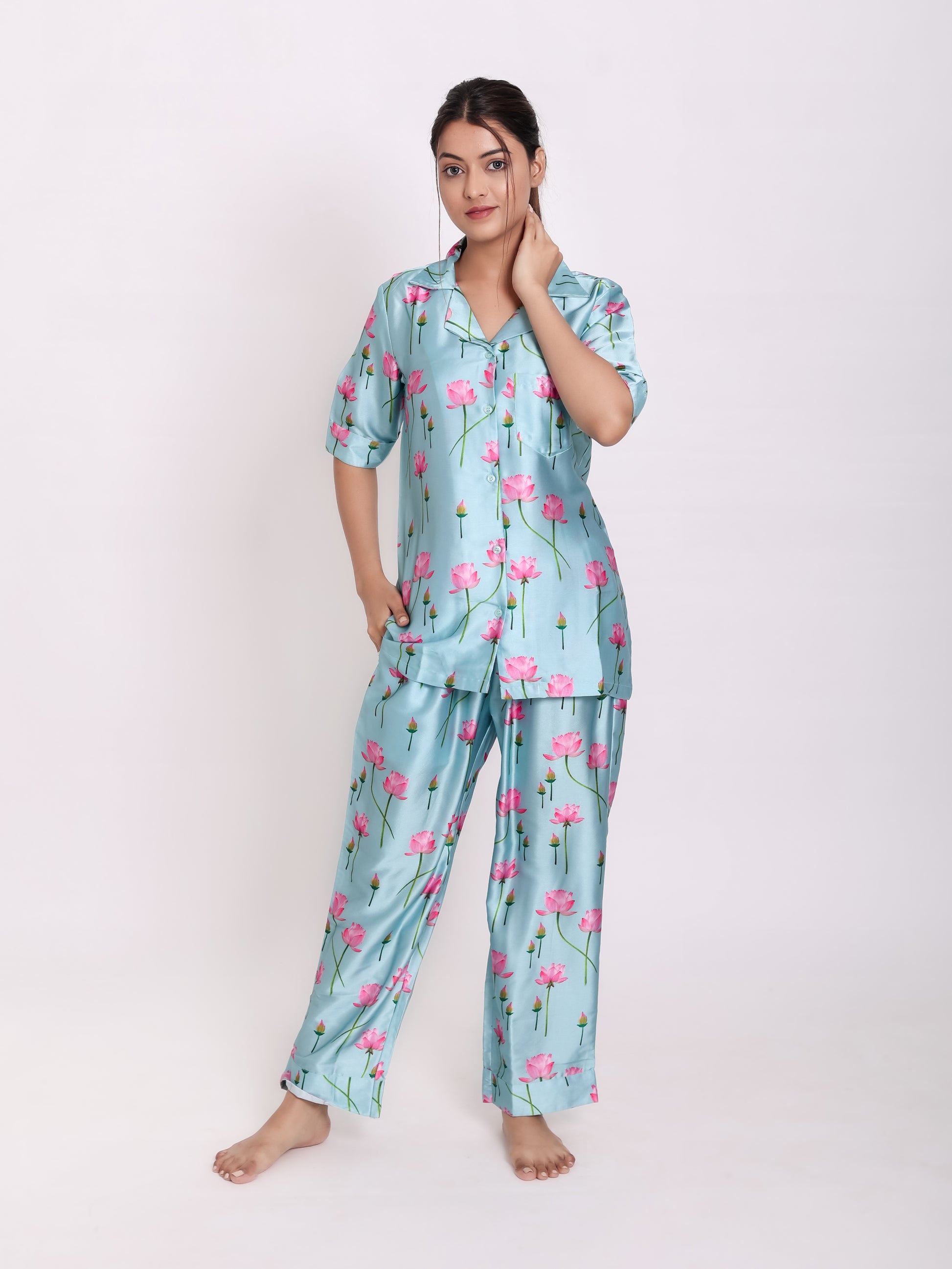 Introducing our ultra soft satin nightsuit this one is crafted with the the softest satin fabric to leave you feeling light and airy.This two-piece set features a top and bottom with a single side pocket and The top is a gorgeous short sleeves and lapel collar will further emphasise your looks.Stay cosy and comfortable throughout the night with our ultra soft satin night suits.It is a stylish and comfortable night suit.