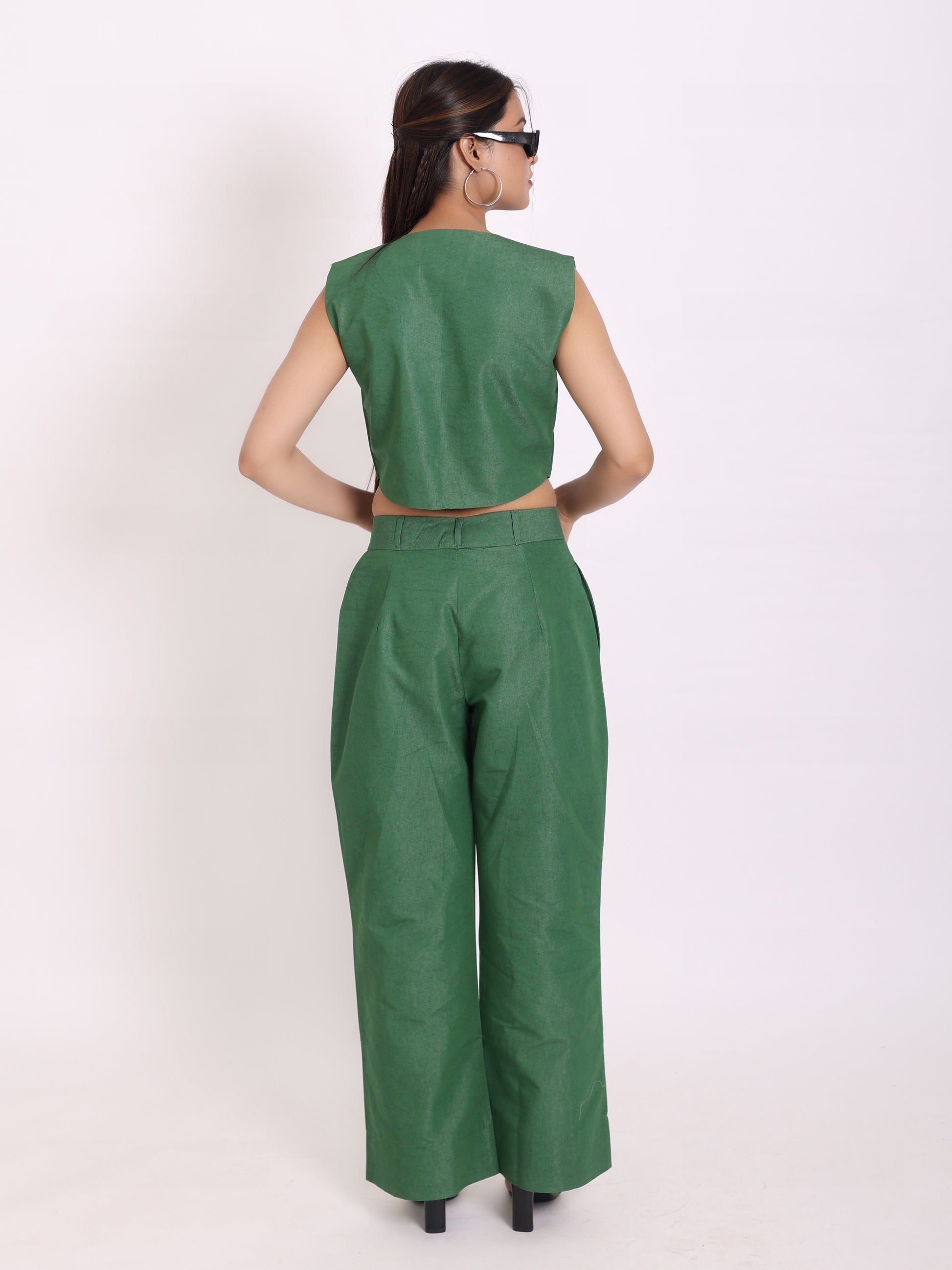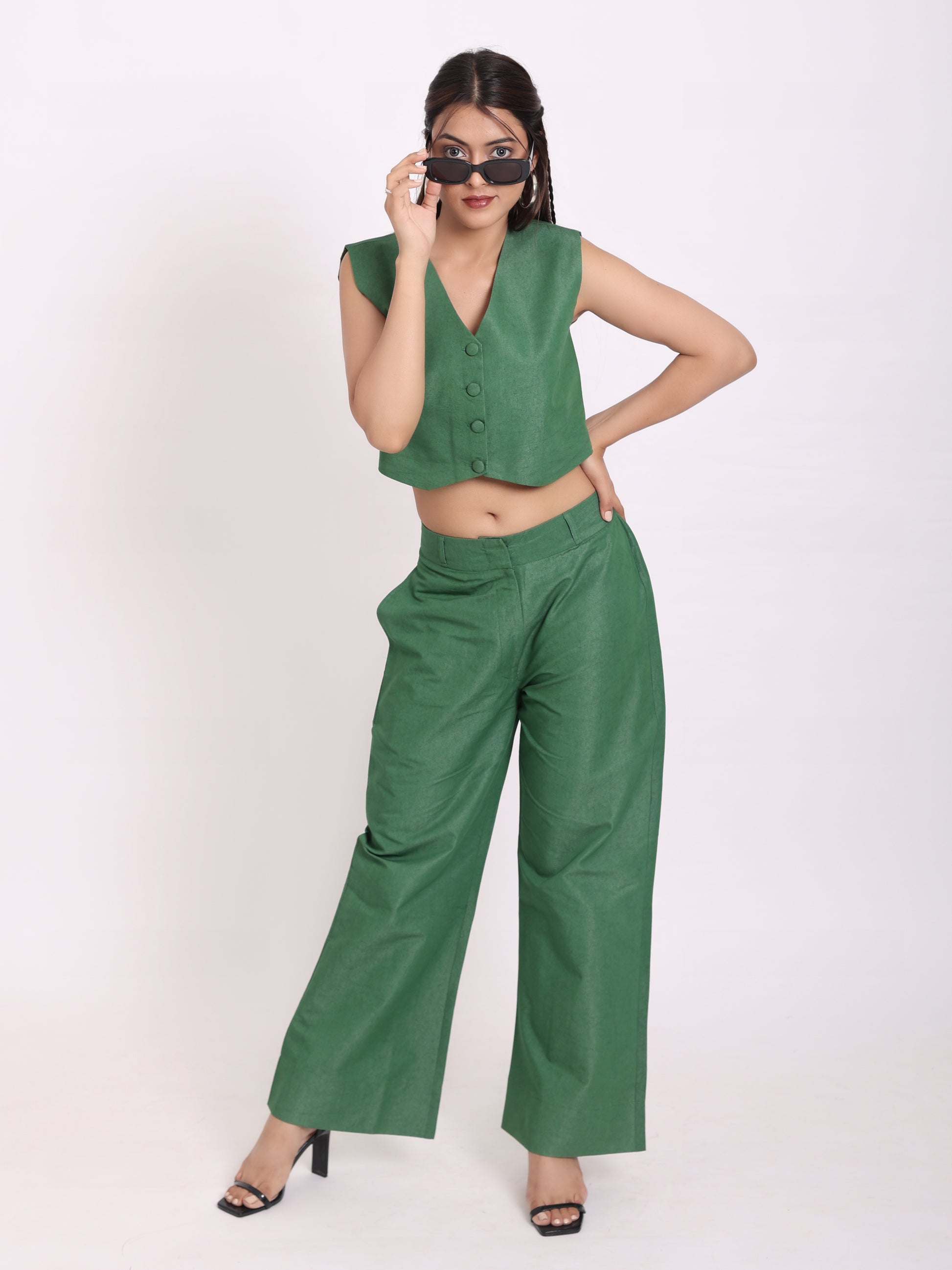 Co-ord sets are two piece outfits that are made by machinge both the pieces in the same fabric, colour, or pattern. They are not only trendy but also highly versatile. This set includes a short top and pant , all made from comfortable and High quality cotton fabric .Front open short crop top with button down and v neck feature and sleeveless sleeves gracefully