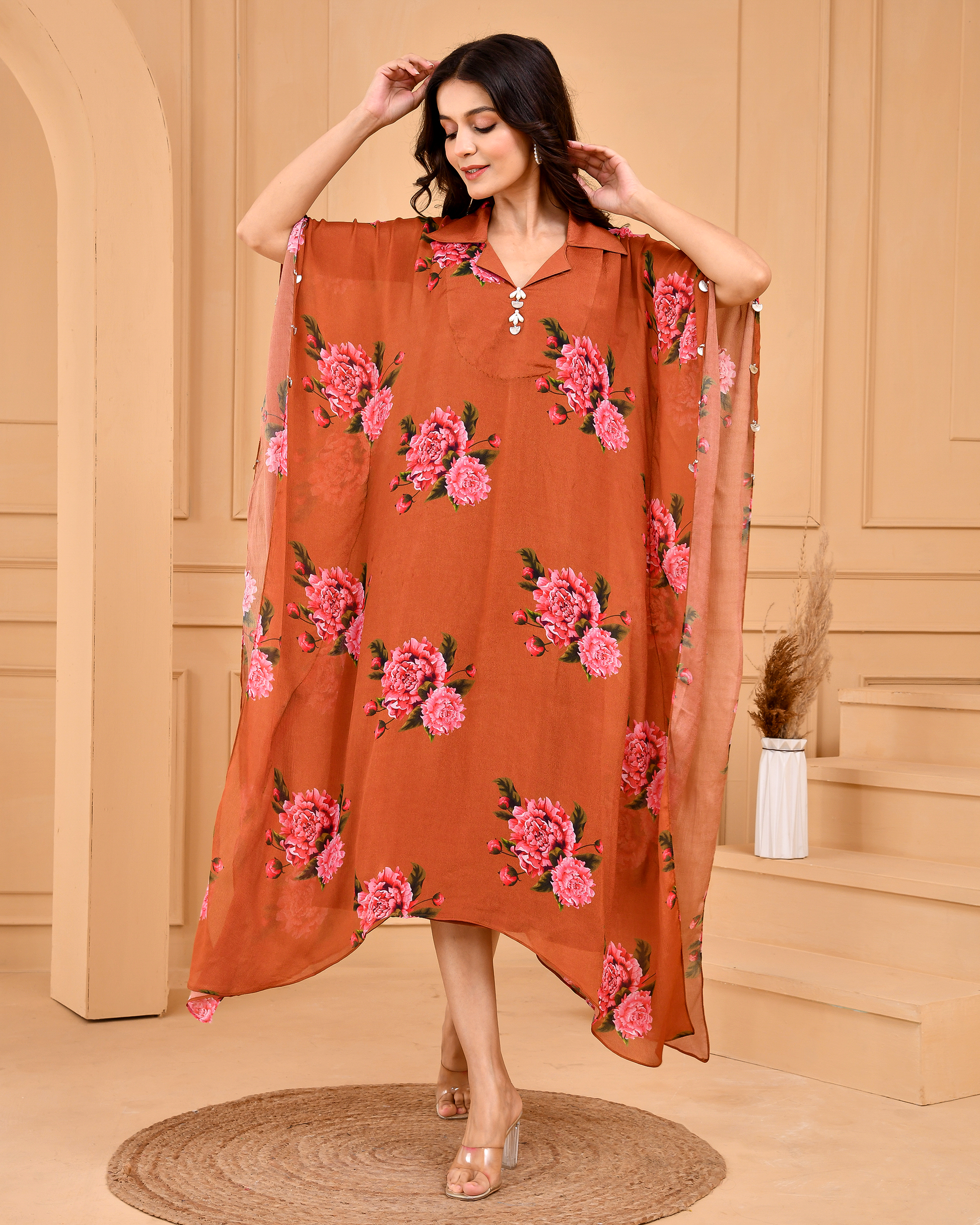 This Caramel brown Kaftan dress is a perfect choice for any occasion, whether you want to lounge at home, hit the beach, or attend a party. It is made from soft and breathable georgette fabric, which drapes beautifully over your body and gives you a relaxed and comfortable fit. The dress also has a stunning print all over, which adds a touch of elegance and style to your look. You can pair this brown kaftan dress with sandals, flats, or heels, and accessorize it with a necklace, earrings, or a scarf, to create different looks for different occasions. This brown kaftan dress is a versatile and fashionable piece that you will love to wear again and again.
