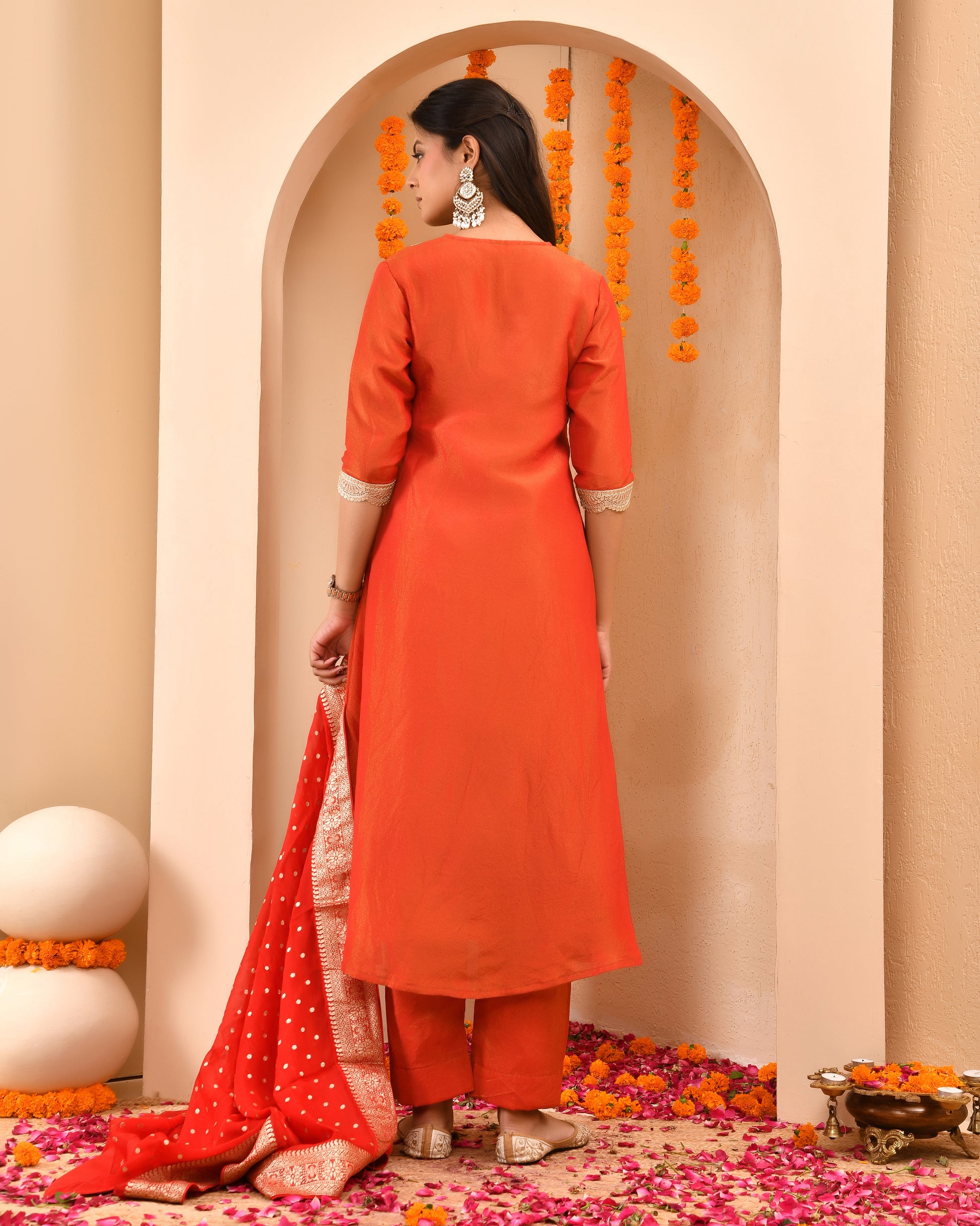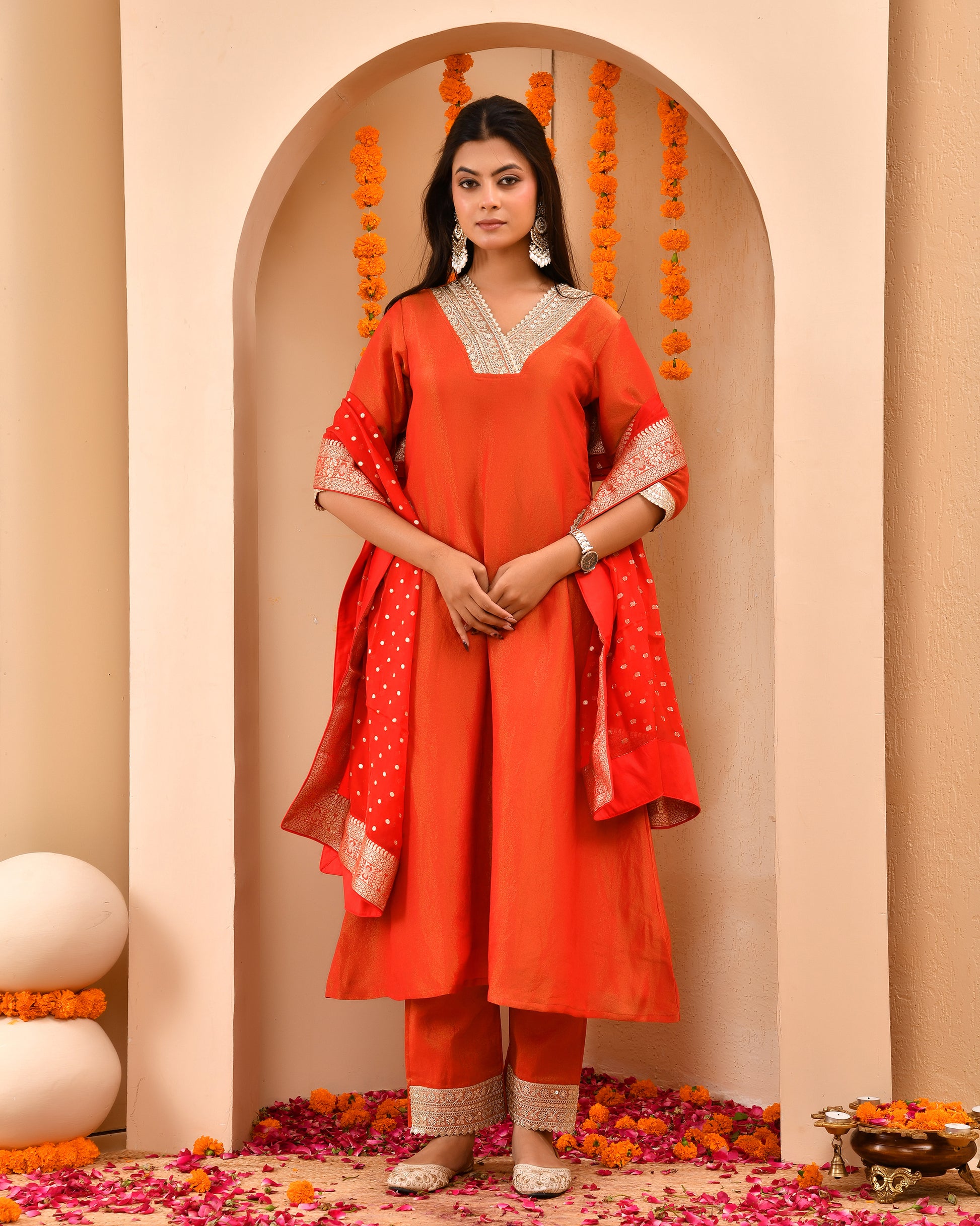 Elevate your festive wardrobe with this elegant Rust Zari Tissue Kurta Set, a timeless ensemble that blends traditional craftsmanship with contemporary charm. Crafted from luxurious zari tissue fabric, the kurta exudes a subtle sheen, making it a perfect choice for festive occasions and celebrations.