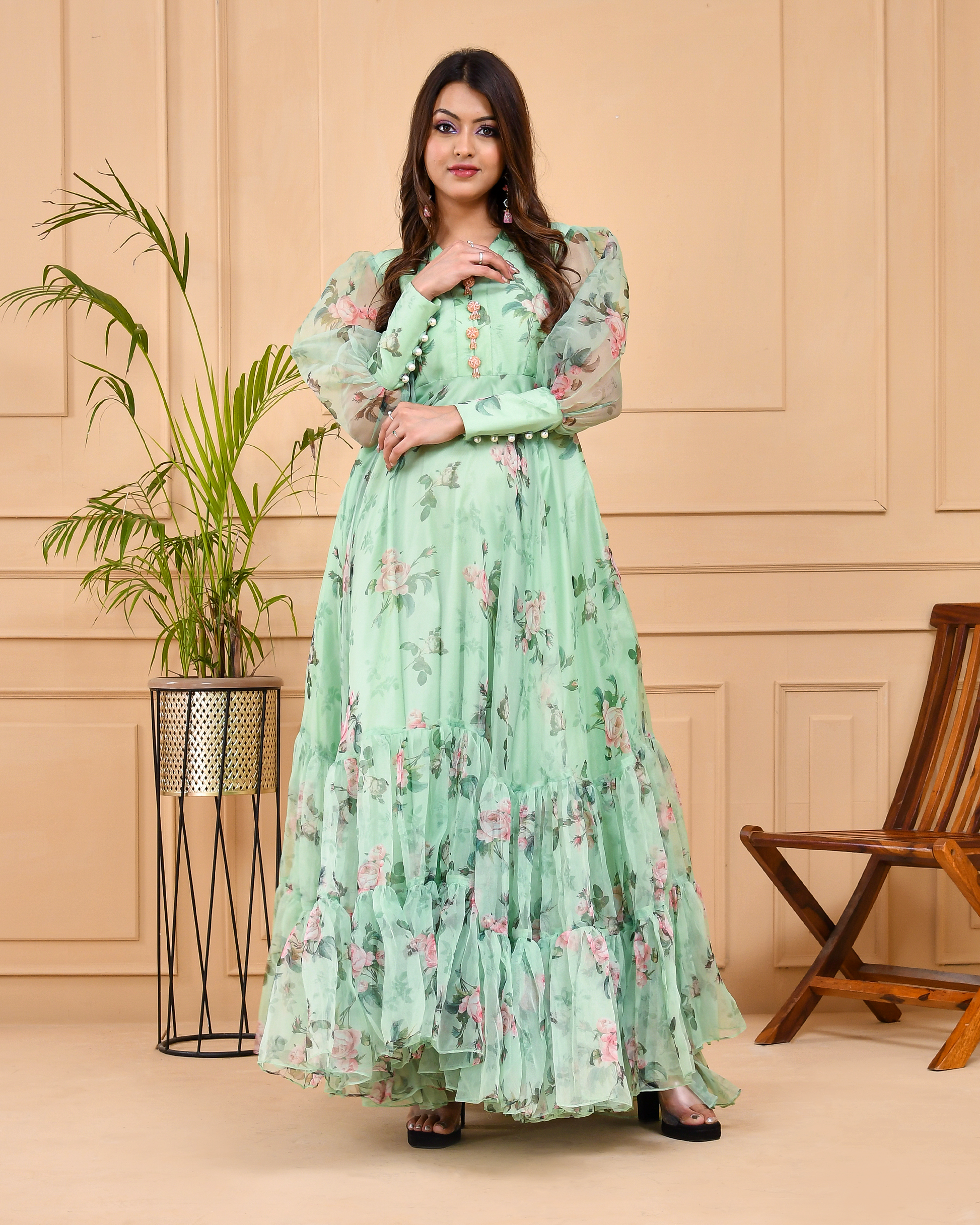Elevate your style with our Long Floral Green Organza Dress – a perfect blend of elegance and modern charm. This enchanting gown features a flowing silhouette in a rich green hue, reminiscent of lush gardens. The sheer organza fabric is adorned with intricate floral print, creating a romantic and captivating look. The long puff sleeve design and V-neckline add a touch of femininity, while the lightweight construction ensures comfort. Whether it's a formal event or a special celebration, this dress is designed to make you stand out with its timeless beauty. Dress to impress and turn heads with this stunning piece.