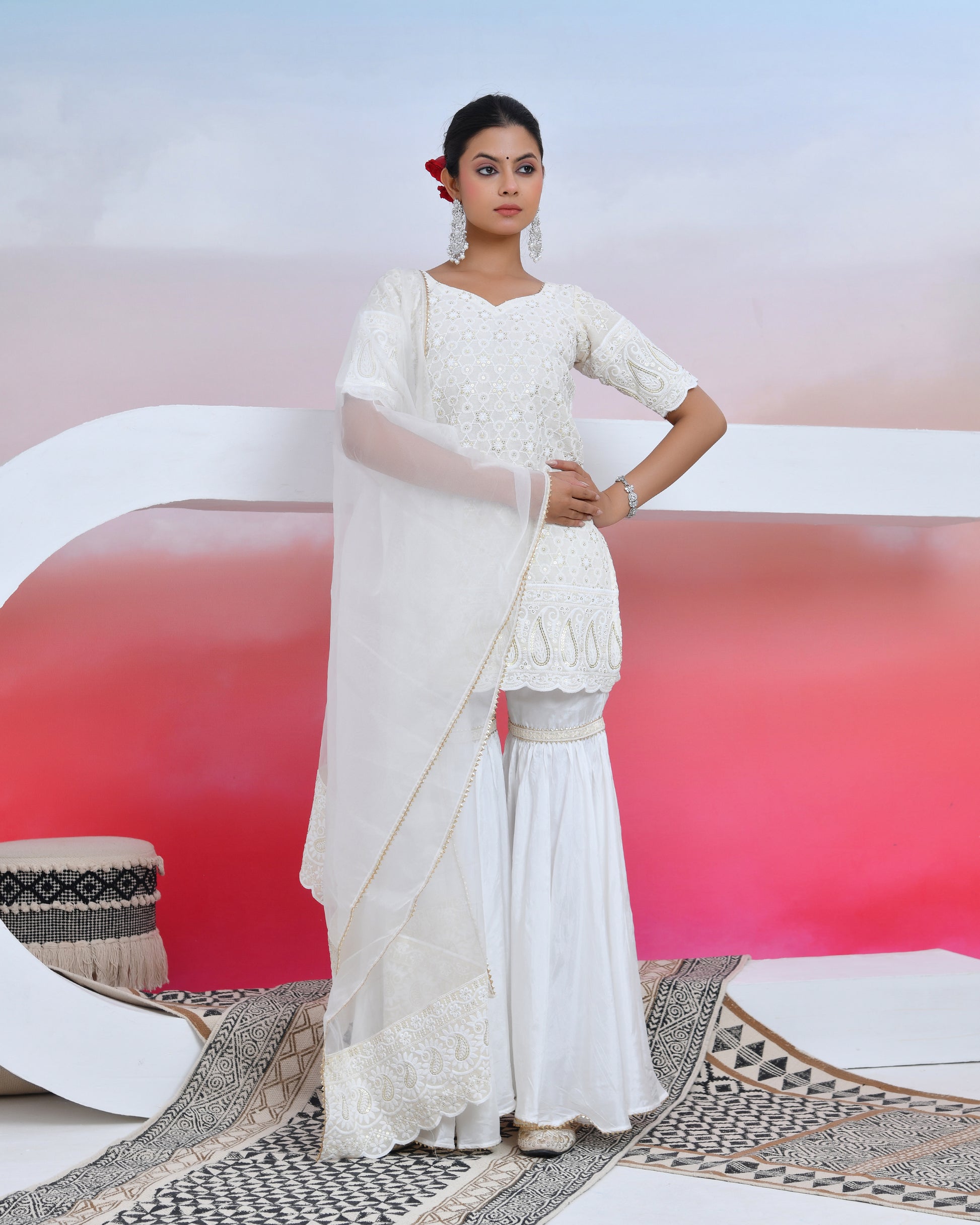 Impress everyone with your stunning traditional look by wearing flora Chikankari Sharara Set.The fabric material is soft and smooth, we have a combination of fine quality fabric, latest designs and fast trending fabric, the fabric is nice and it fits well, this designer kurta, sharara and dupatta set is perfect for any occasion Can be worn on. You can wear it comfortably all day long