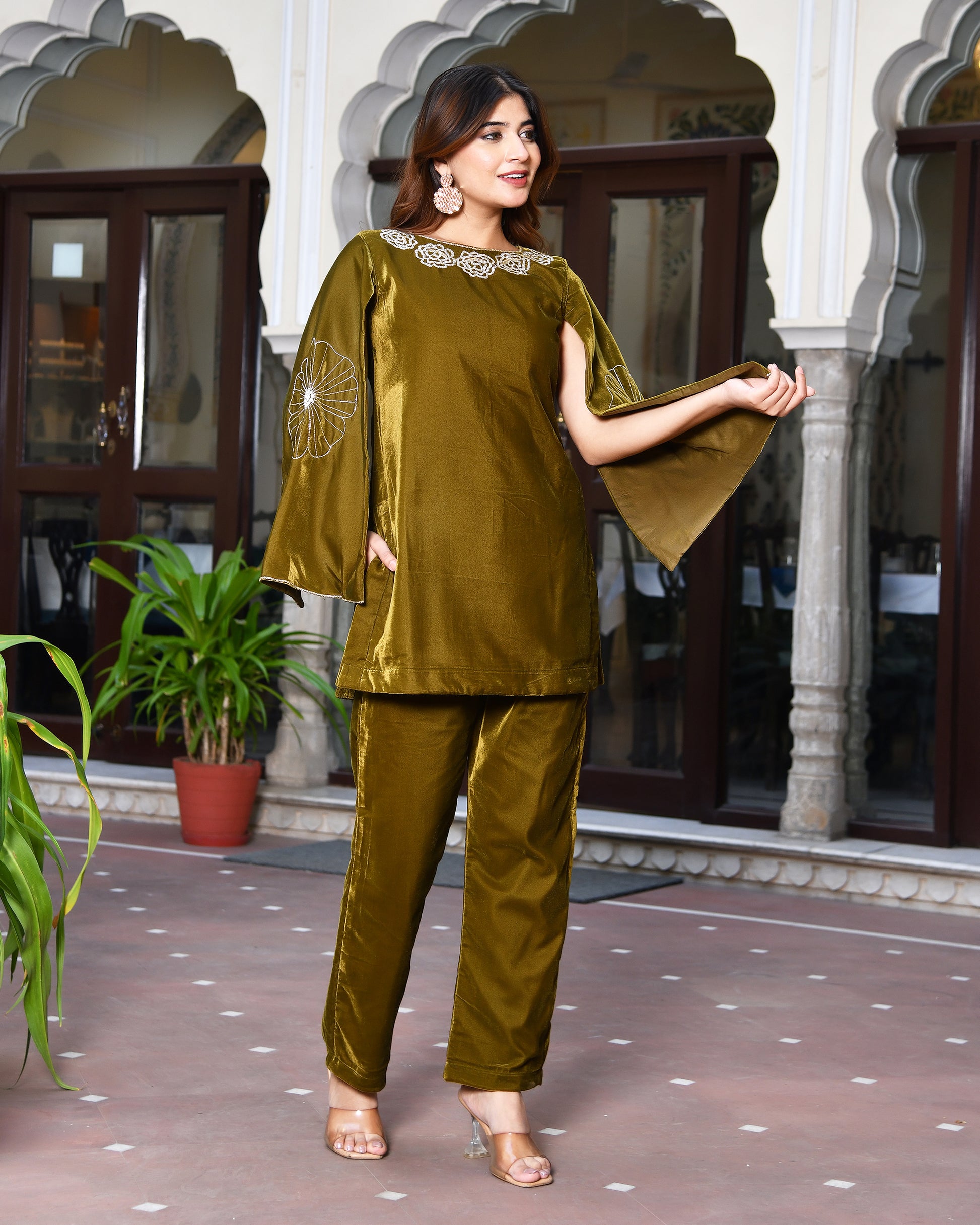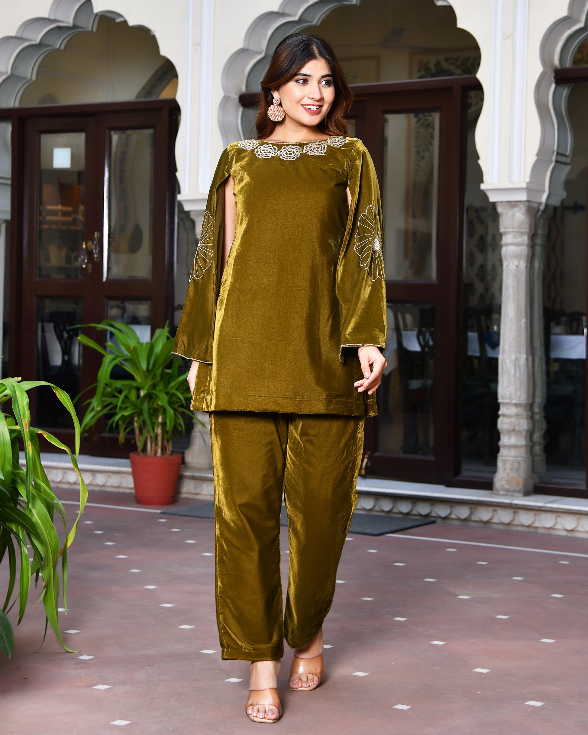 The silhouette is elevated with stylish slit bell sleeves, giving the outfit a contemporary yet graceful touch. Paired with matching velvet straight pants, this co-ord set offers both comfort and polished elegance, making it perfect for festive gatherings and evening occasions.