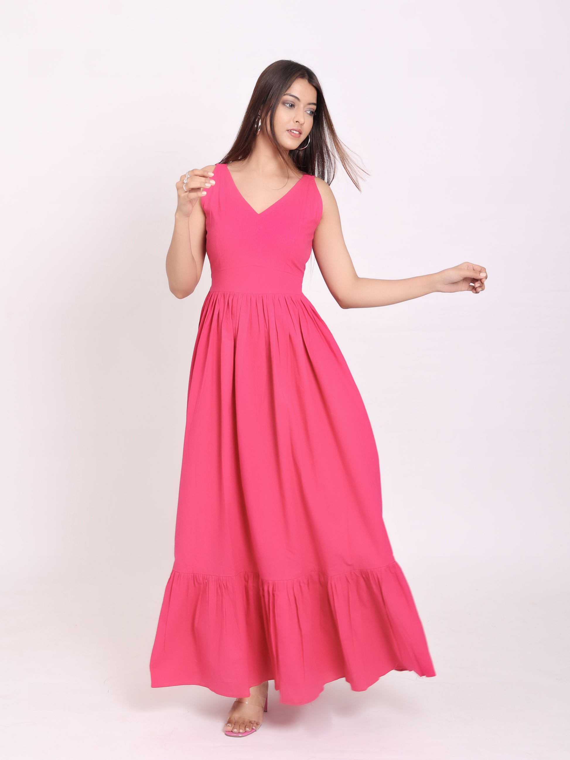 This beautiful gorgeous hot pink dress will be perfect for a date night or a brunch with your besties. The dress is beautifully designed with a V neck with single tier at the bottom.