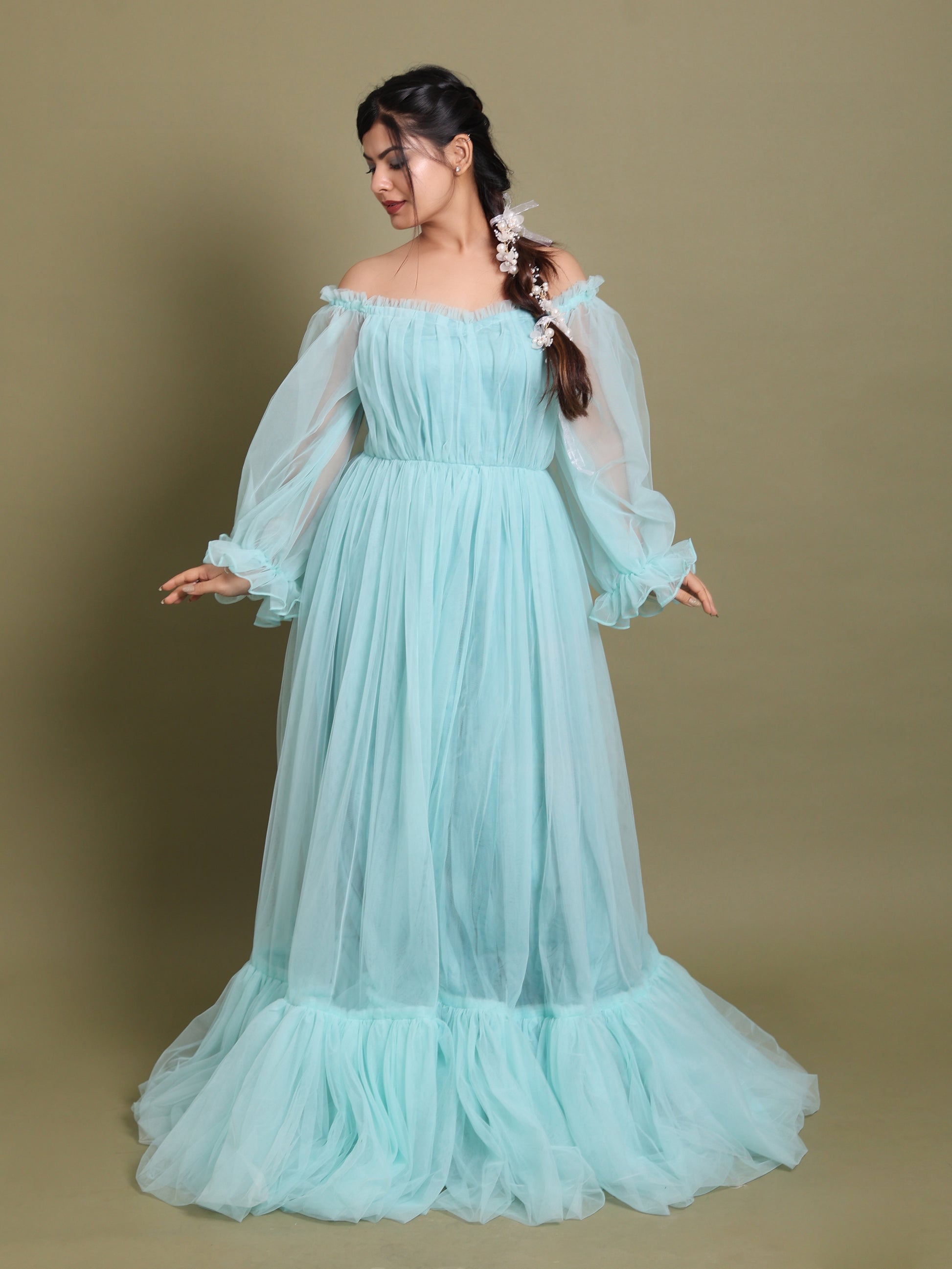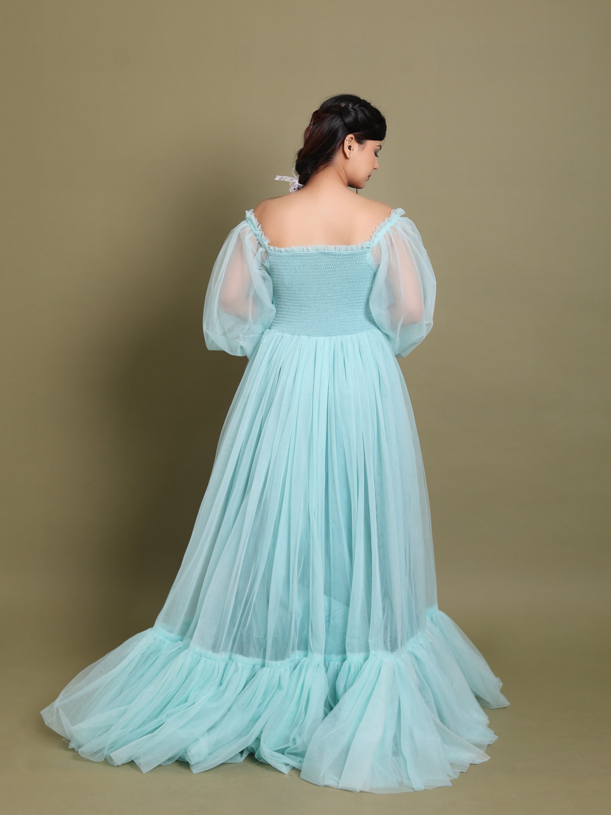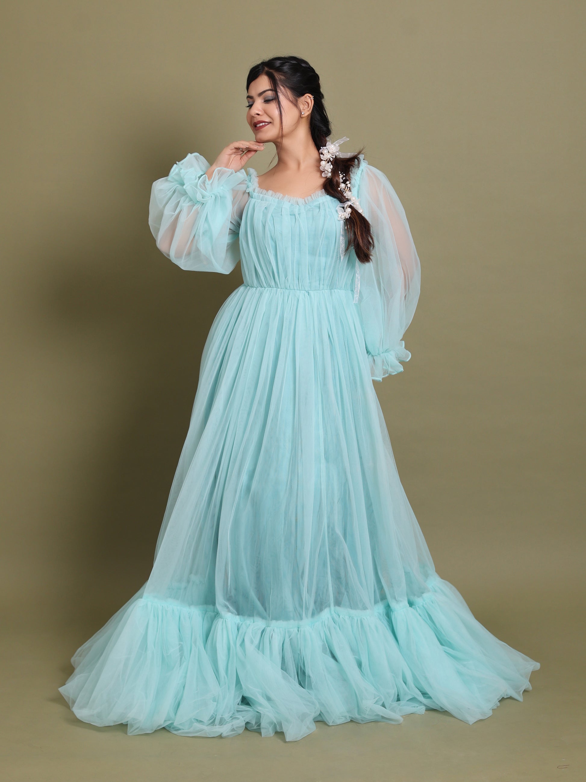 If you want to feel like a princess then you must add this Ice blue dress to your wardrobe. Feel like a princess by wearing this dress.Crafted from soft and breathable Net fabric, this dress ensures both comfort and confidence. it is long sleeve and features balloon style sleeve and ilasticated back for perfect fitting