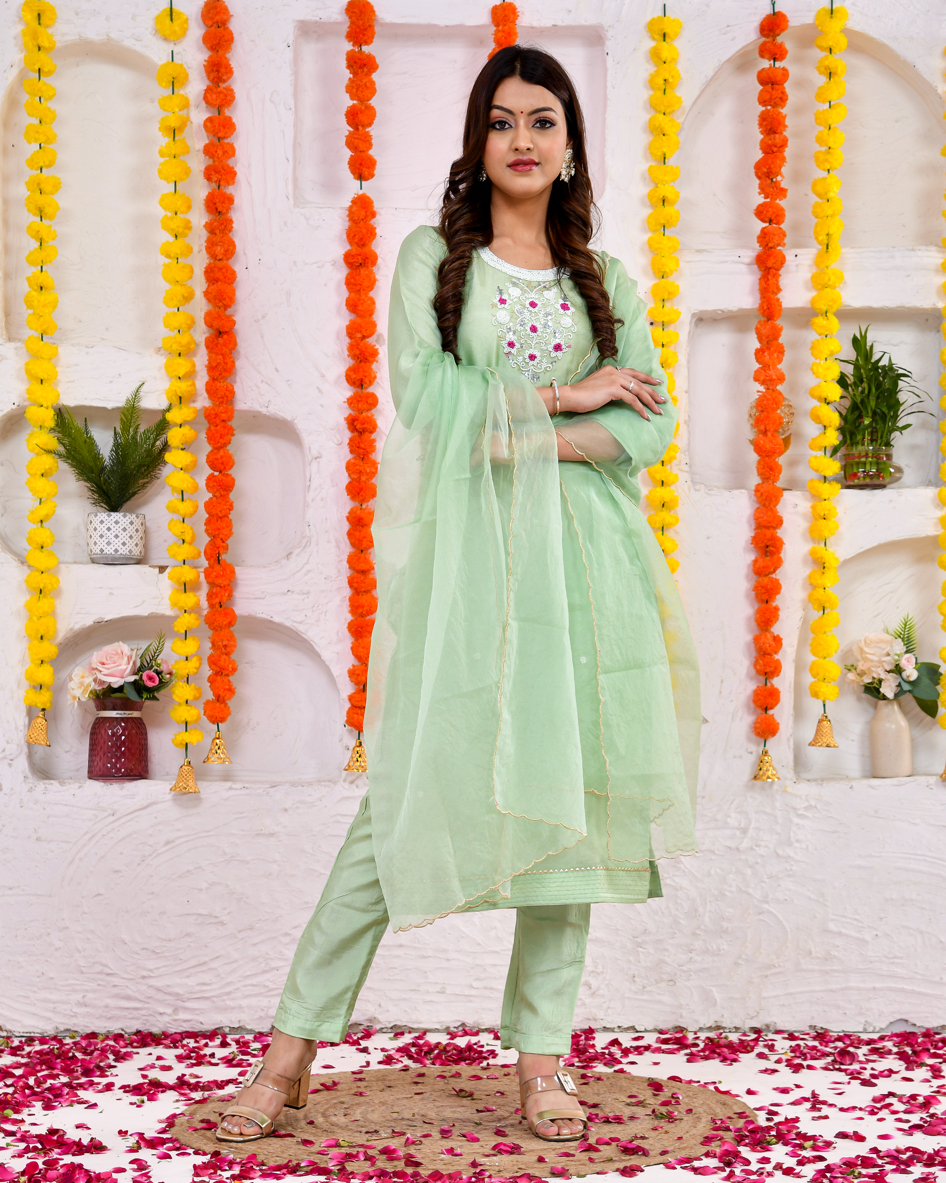 Indulge in elegance with our Silk Handwork Kurta and Pant Set with Dupatta. Crafted from luxurious silk, the intricate handwork detailing on the kurta adds a touch of sophistication to your look. The tailored pants and matching dupatta complete this ensemble, making it perfect for weddings, festivities, and special occasions. Elevate your style effortlessly with this timeless set, where traditional craftsmanship meets modern flair. Shop now for a captivating and versatile addition to your wardrobe.