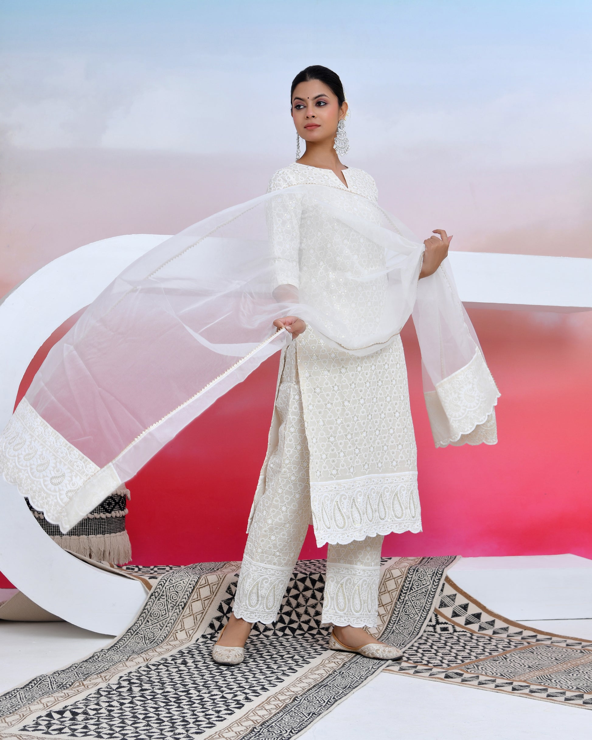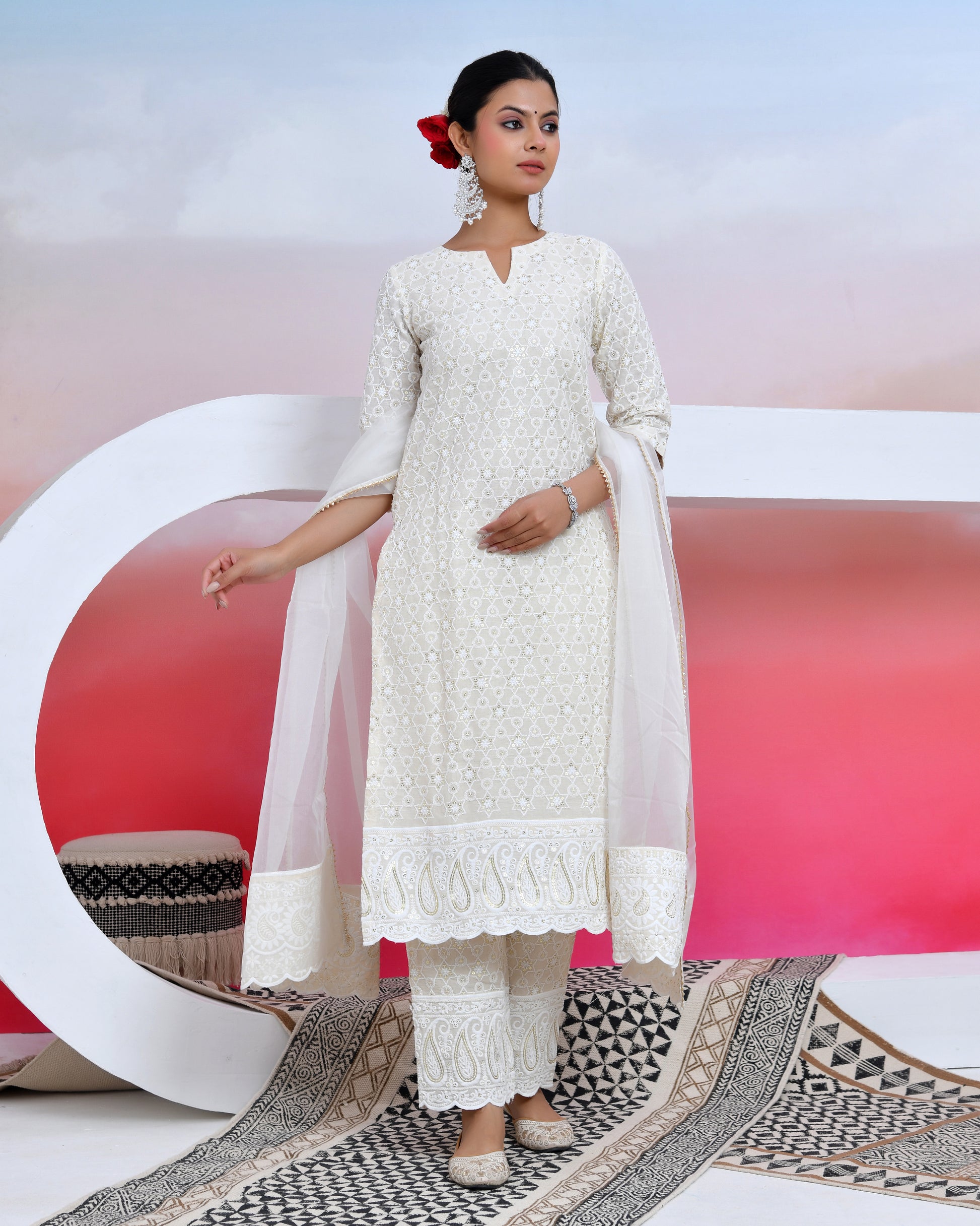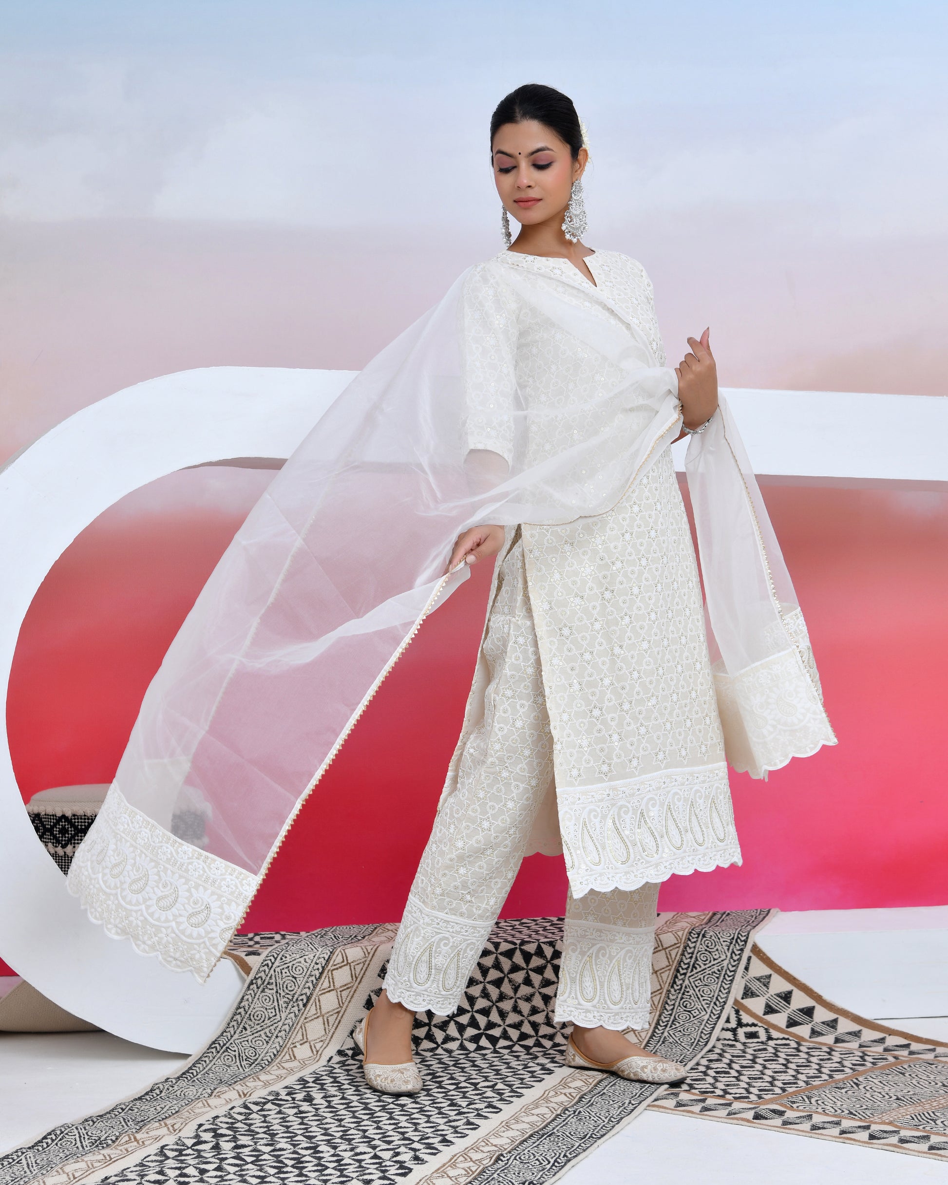 sassy white lily suit set is the trend of this session ! style up the look with chikankari material suit and white dupatta made of organza that that add elegance to the dress The set has a straight kurta and organza dupatta with sequin all over work and matching pants.