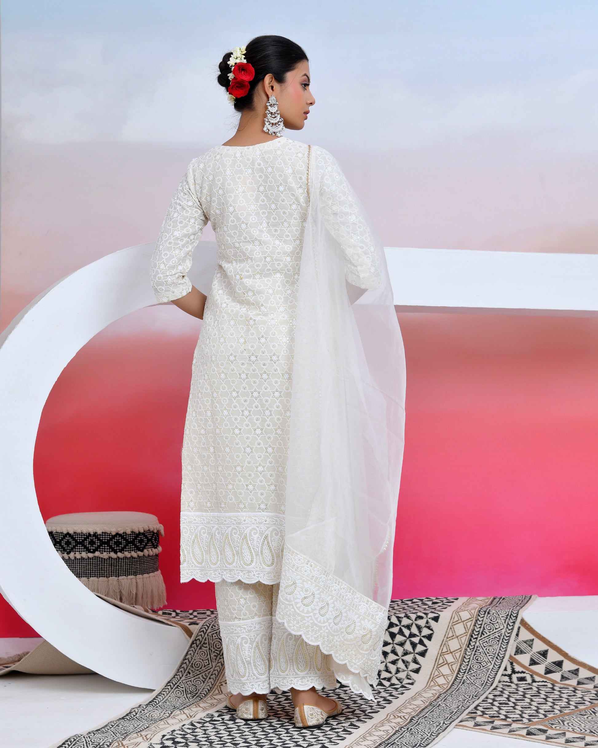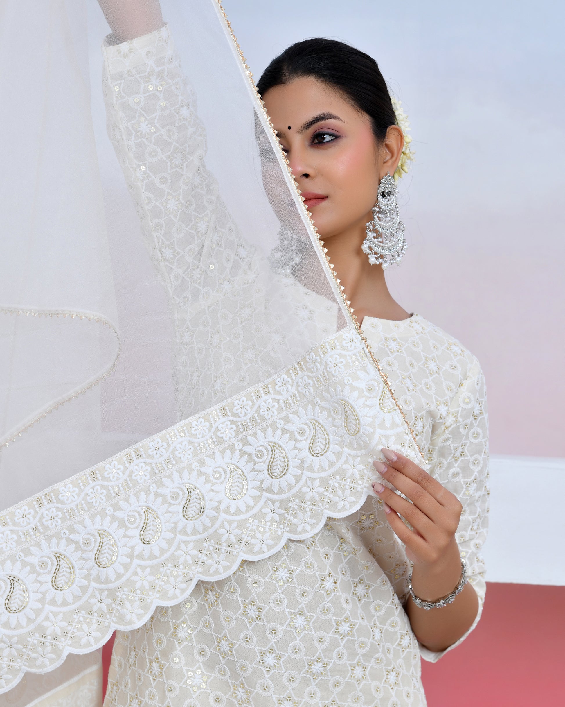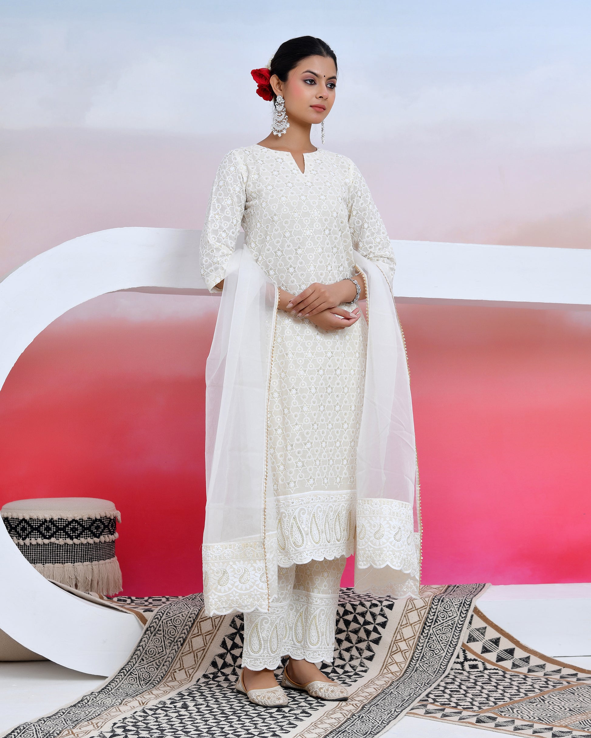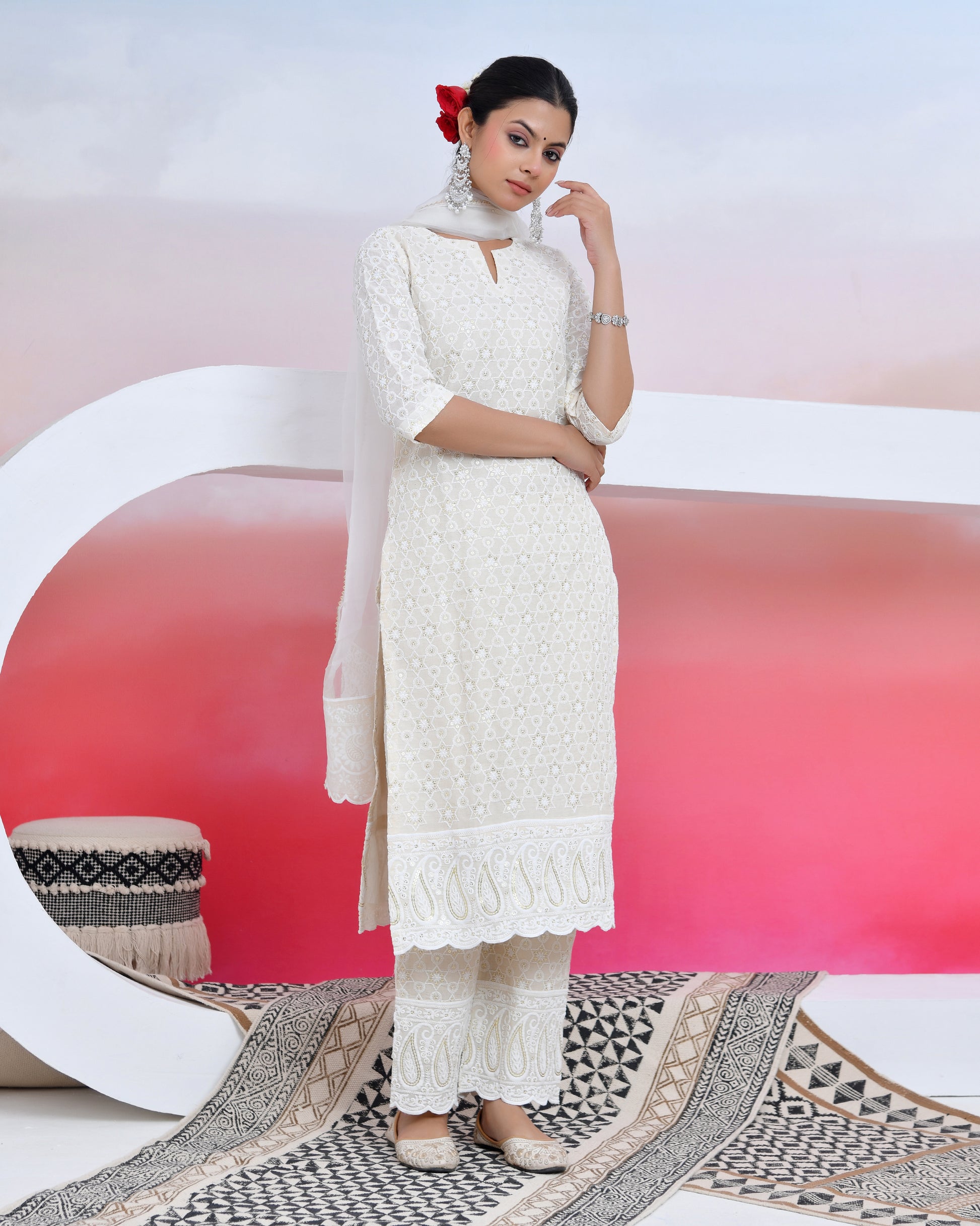 sassy white lily suit set is the trend of this session ! style up the look with chikankari material suit and white dupatta made of organza that that add elegance to the dress The set has a straight kurta and organza dupatta with sequin all over work and matching pants.