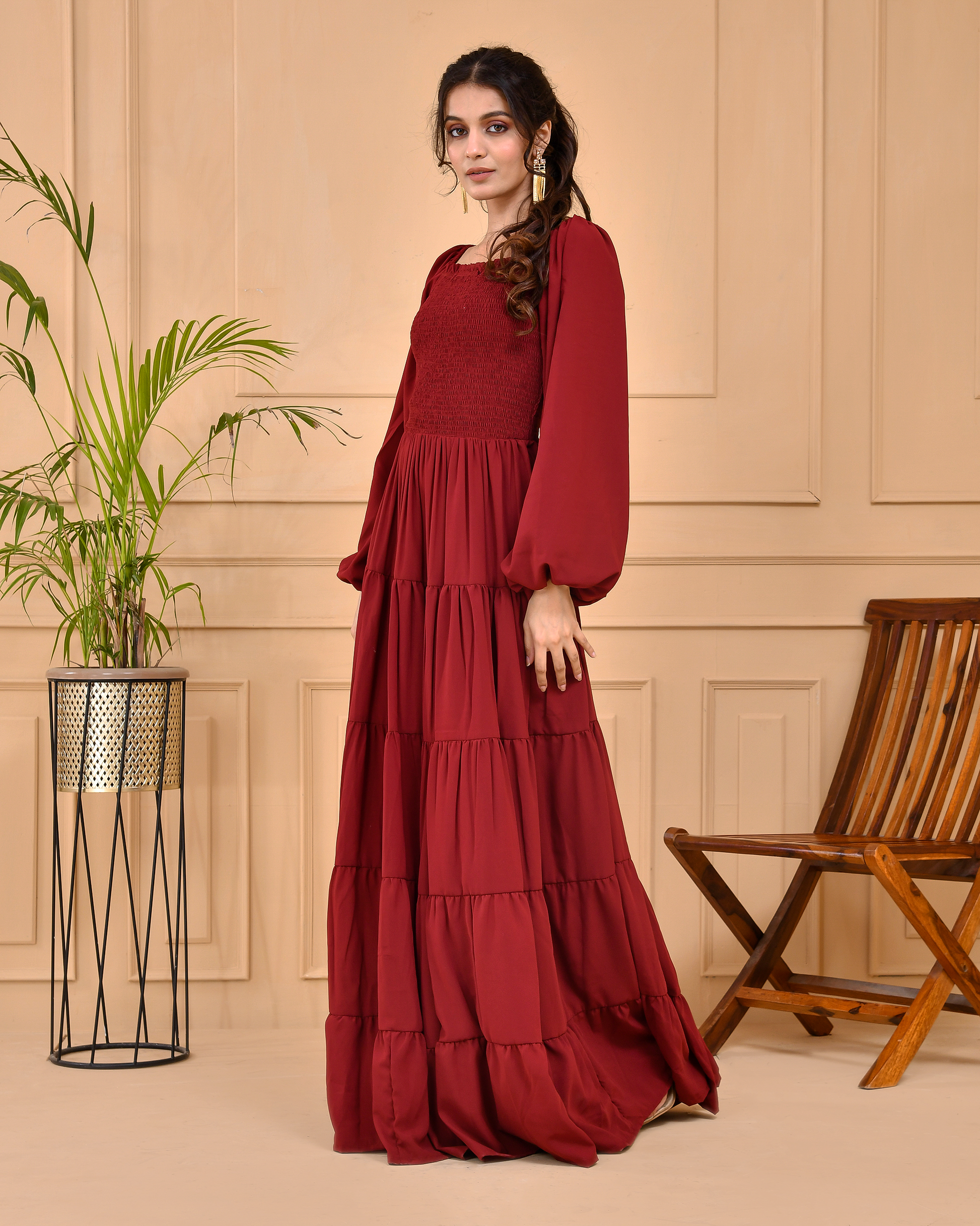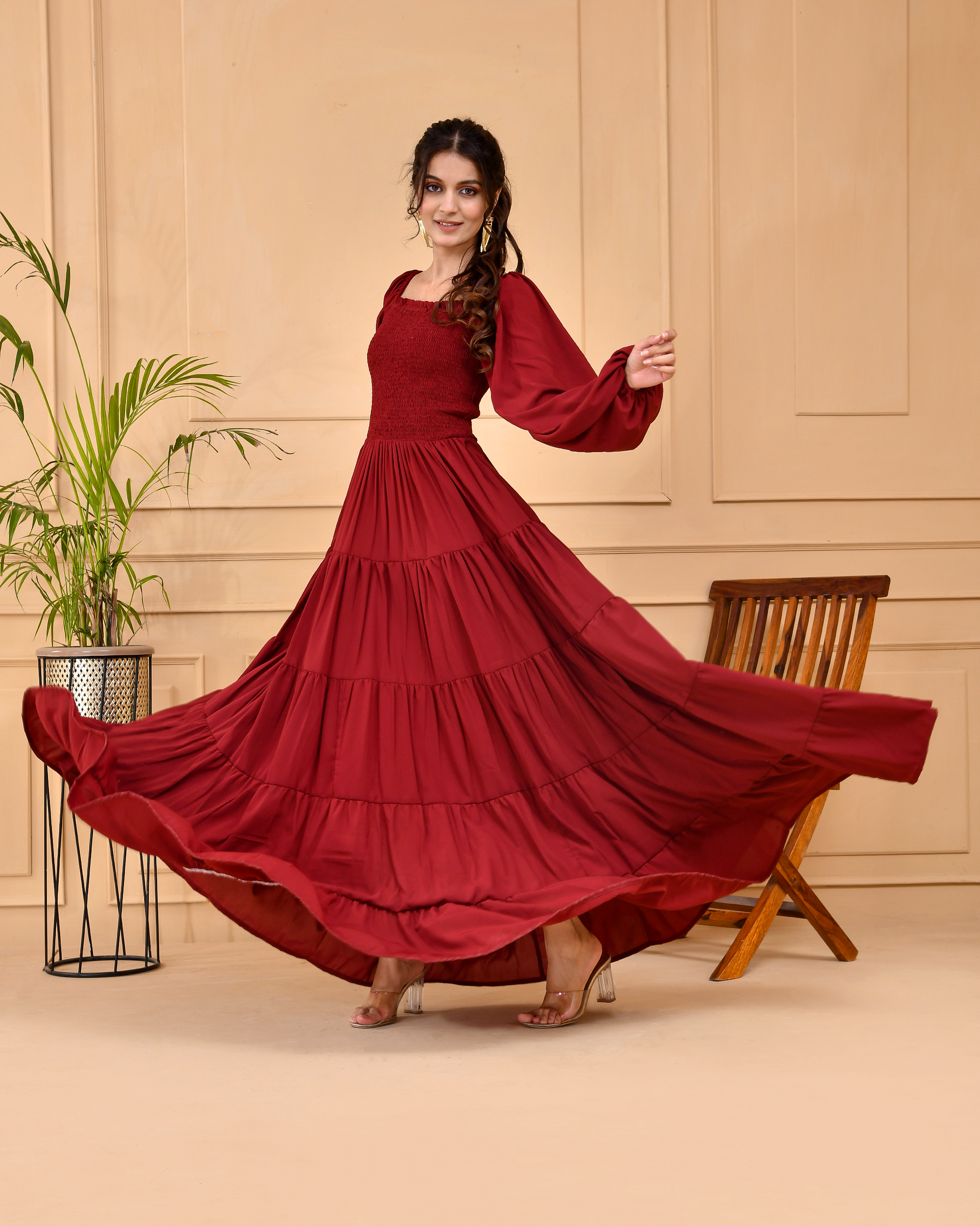 This dress not only looks stunning but also feels incredibly comfortable against the skin. The luxurious fabric drapes beautifully, making it perfect for both formal occasions and stylish casual events.The versatility of this dress knows no bounds – pair it with your favorite heels and statement jewelry for an elegant evening look, or dress it down with sandals for a chic daytime ensemble. The timeless appeal of the Maroon Long Tier Dress ensures that it will be a staple in your wardrobe for seasons to come.