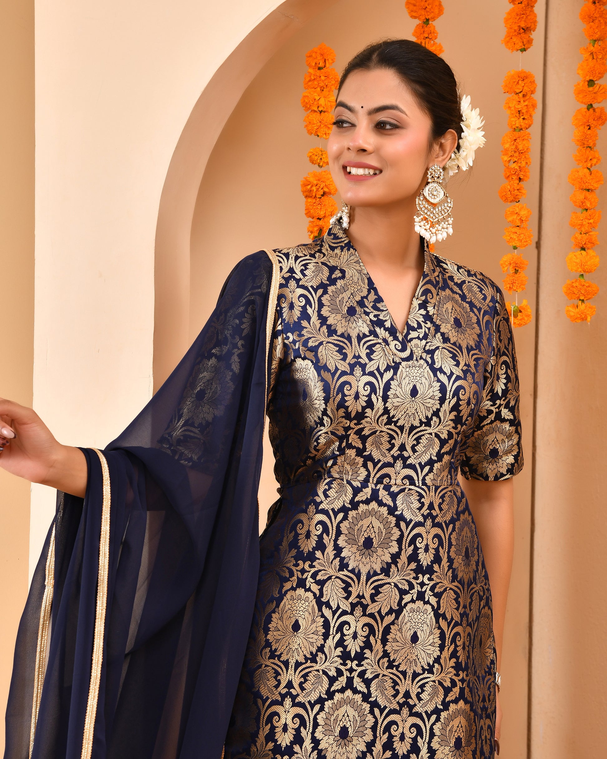 This brocade Sharara set is designed for those who appreciate a blend of classic and contemporary style. A simple yet elegant brocade tunic in a luxurious blue and gold fabric. The fabric showcases a rich, intricate pattern that catches the light beautifully, adding depth and texture without being overly ornate. It has a flattering V-neckline and short sleeves, making it perfect for warm weather or indoor events. The sharara pants are made from the same luxurious brocade fabric and are tailored with a flared cut, giving the outfit a modern, stylish silhouette. This set is ideal for festive occasions, casual gatherings, or semi-formal events. Its simplicity combined with the luxurious fabric and thoughtful design creates a timeless look that is both stylish and comfortable.