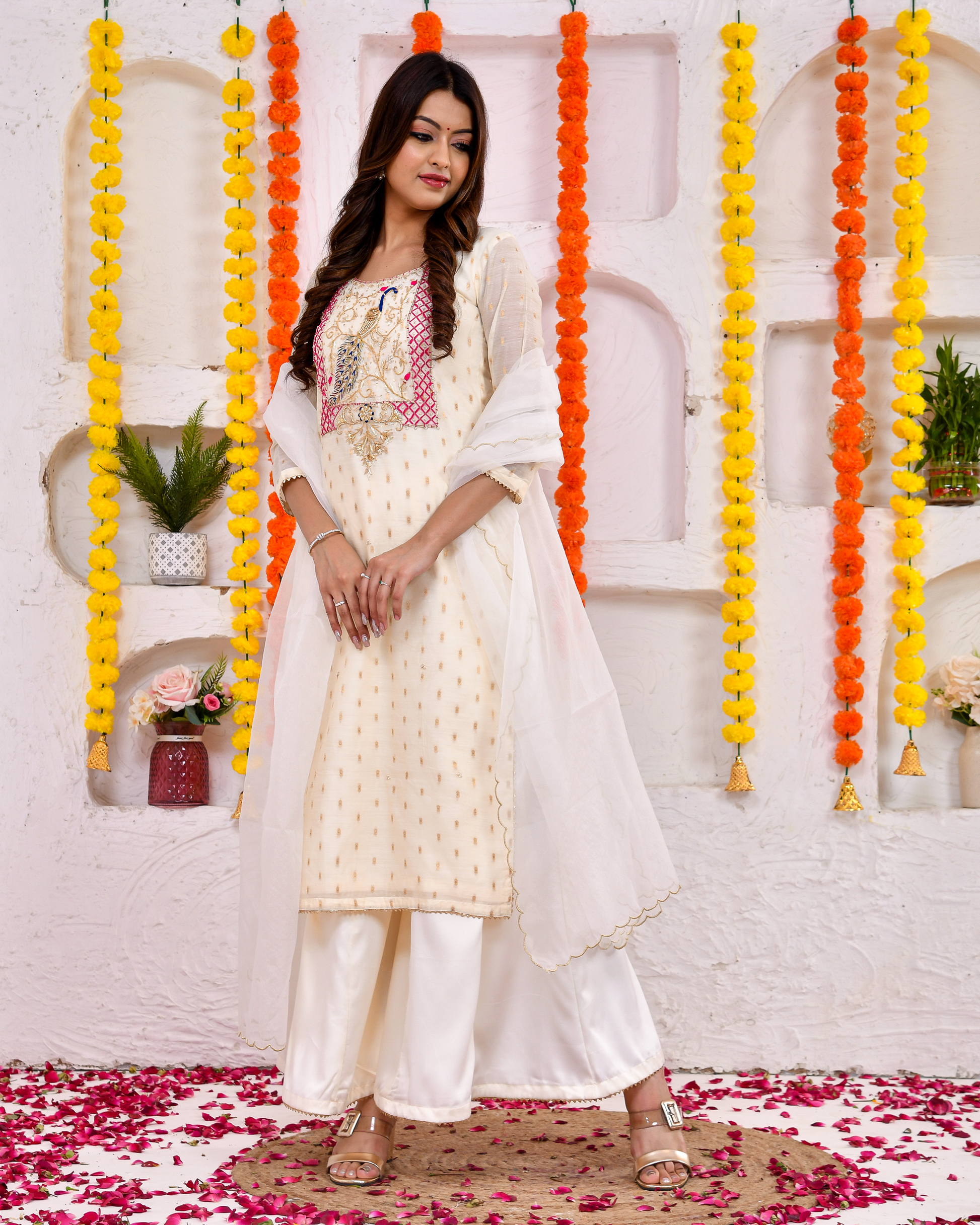 Step into timeless elegance with our White Chanderi Hand Work Kurta, Sharara, and Dupatta Set. Crafted from luxurious Chanderi fabric, this ensemble features intricate peacock handwork, adding regal charm to the classic silhouette. The wide-legged sharara bottoms and matching dupatta complete the look, making it perfect for any festive occasion. Elevate your ethnic wardrobe with this versatile and gracefully detailed ensemble.