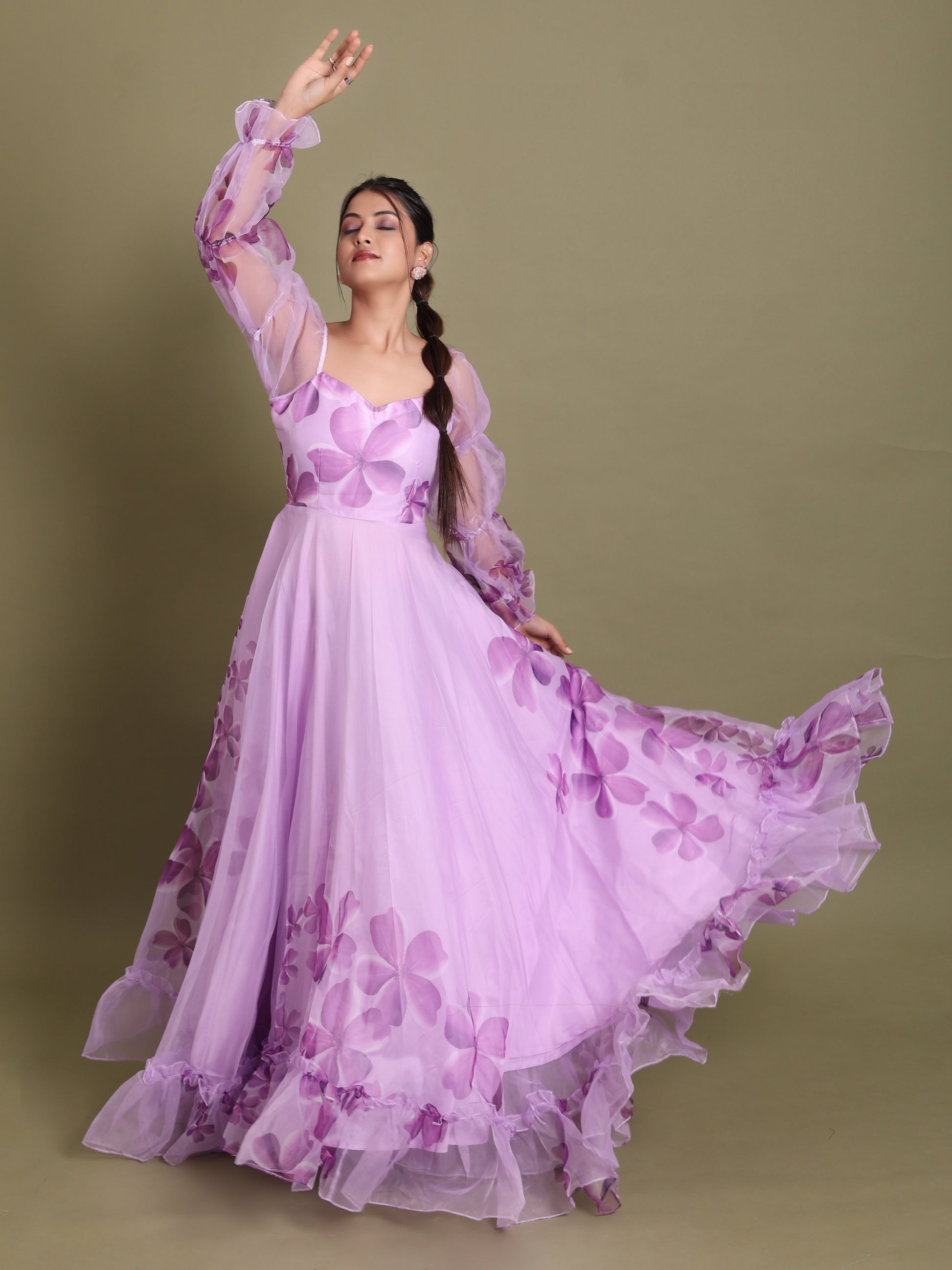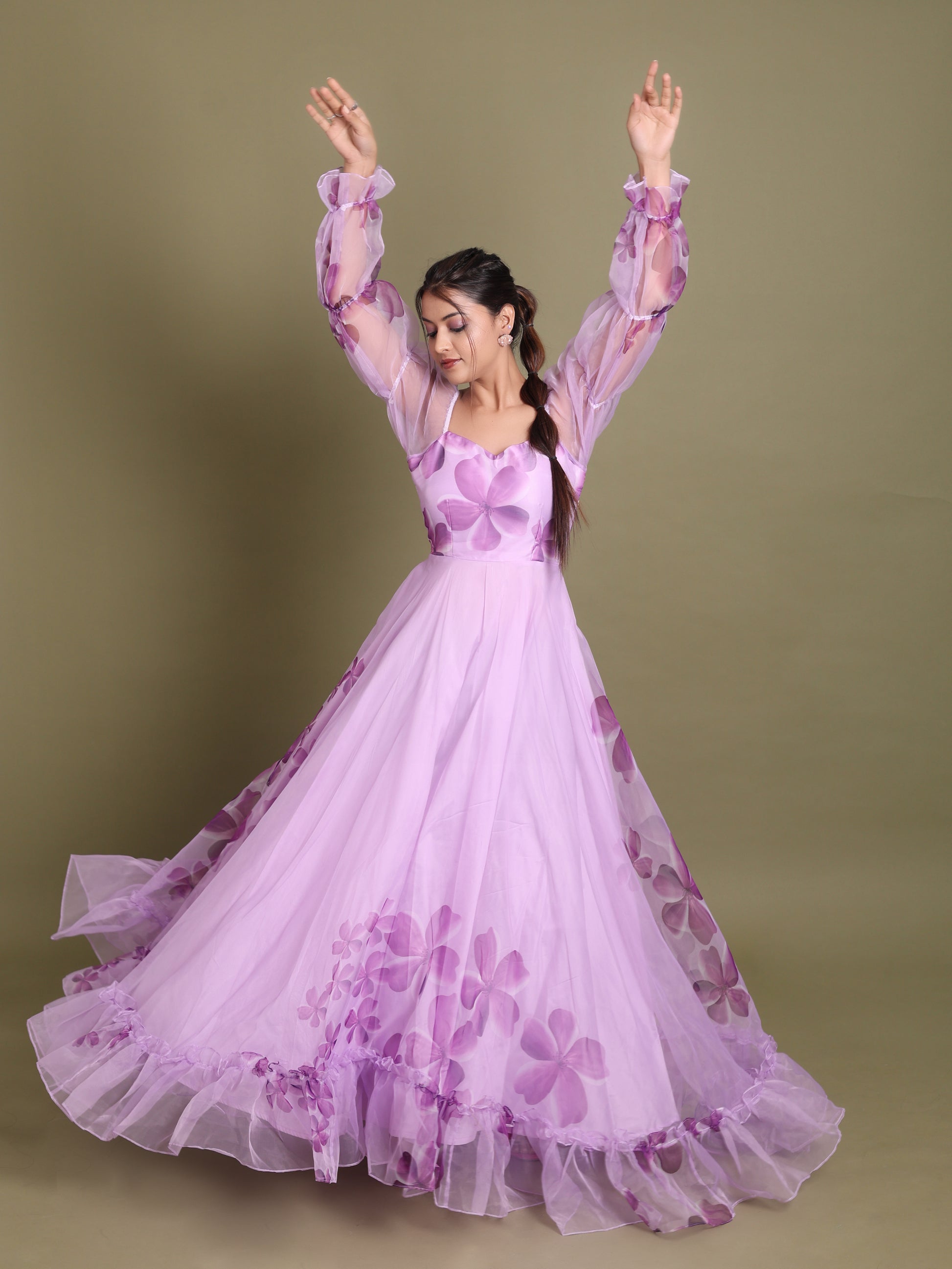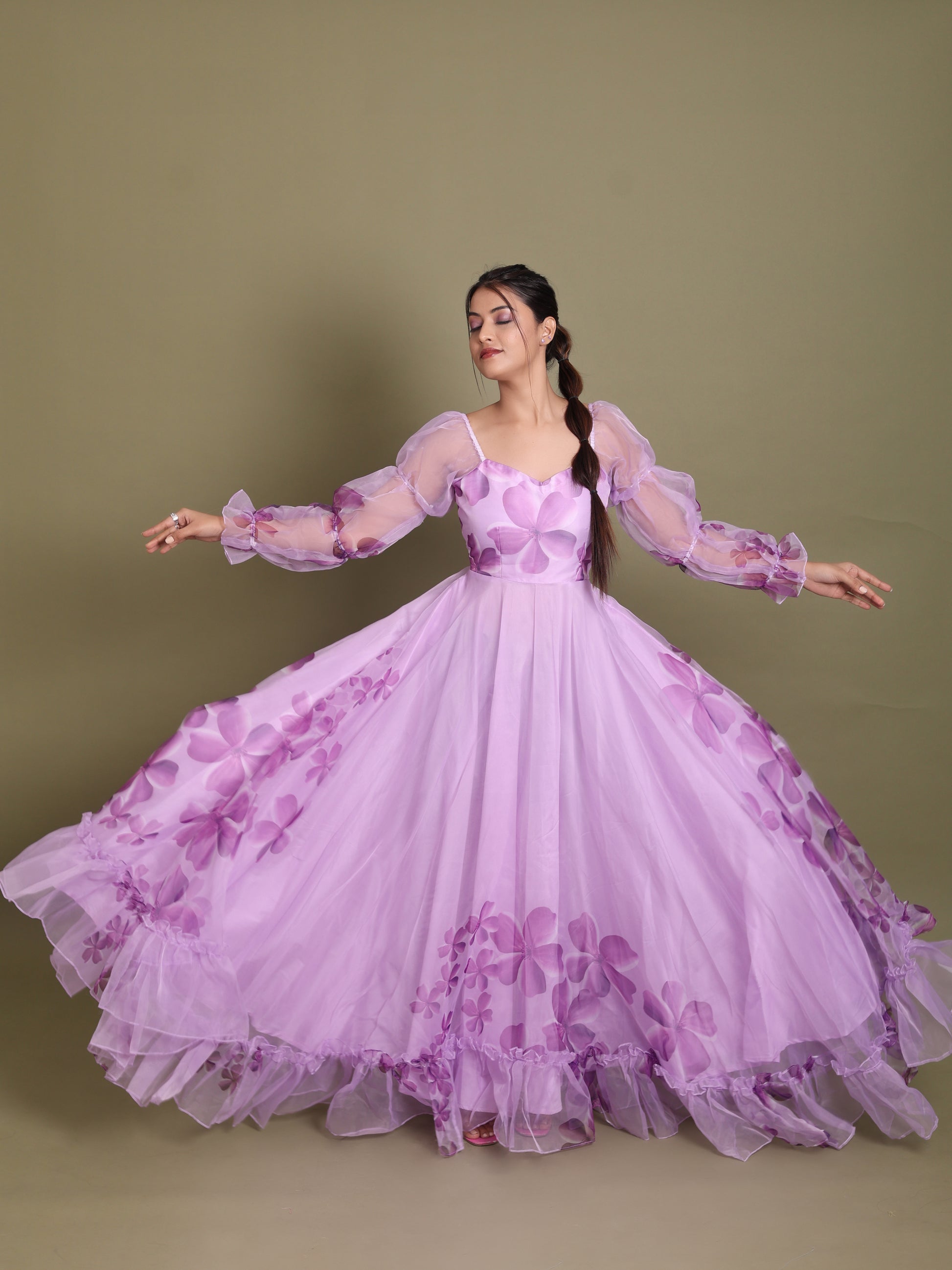 This periwinkle maxi dress is a perfect pretty look. The contrasting colors complement each other. The Dress made in a flowing tiered skirt and voluminous sheer sleeves is adding perfection to the western look. this dress features a diamond neck and floral lavender stunning colour