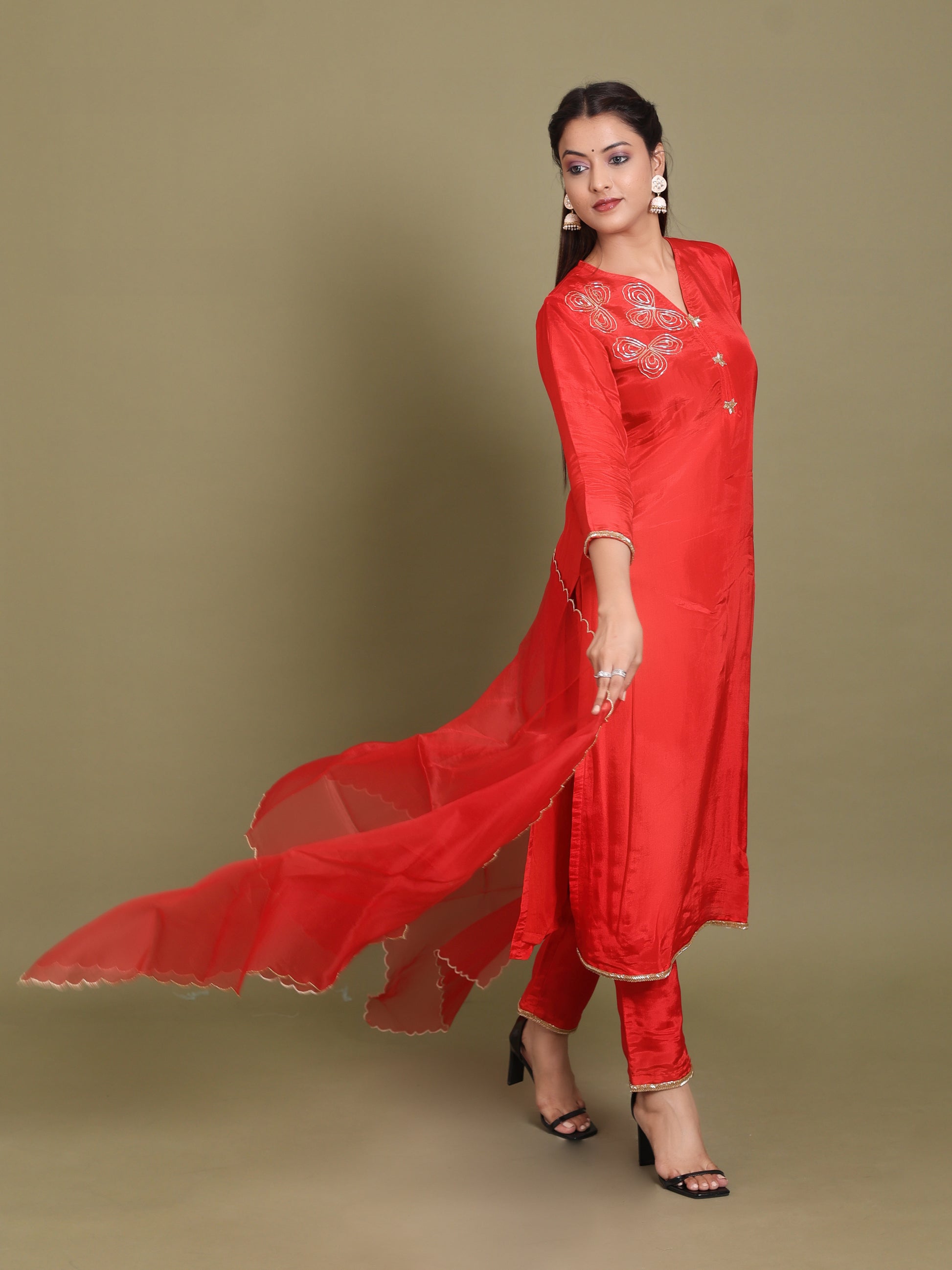 Expand your unique style with DRESSES Persian Red Suit Set. This is an exquisite mix of silk kurta and silk pant with beautiful all-side scalloped dupatta. The kurta is hand embroidered with a stunning motif and the 3/4th sleeve also has a handmade border. This stunning suit set is perfect for special occasions, weddings and festivals. and definitely After wearing this beautiful suit set , your beauty will increase more