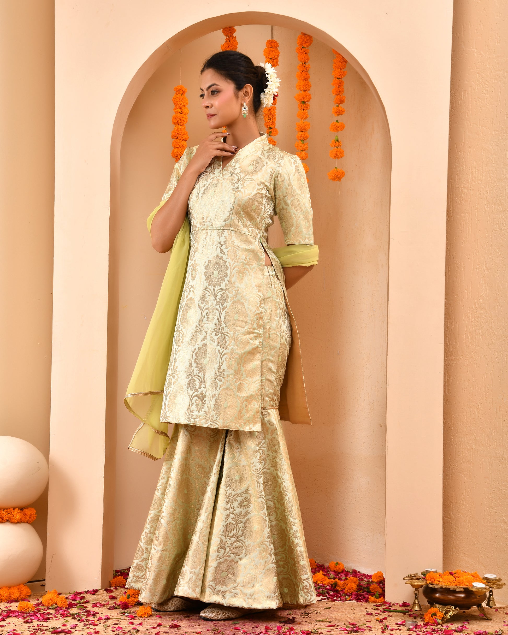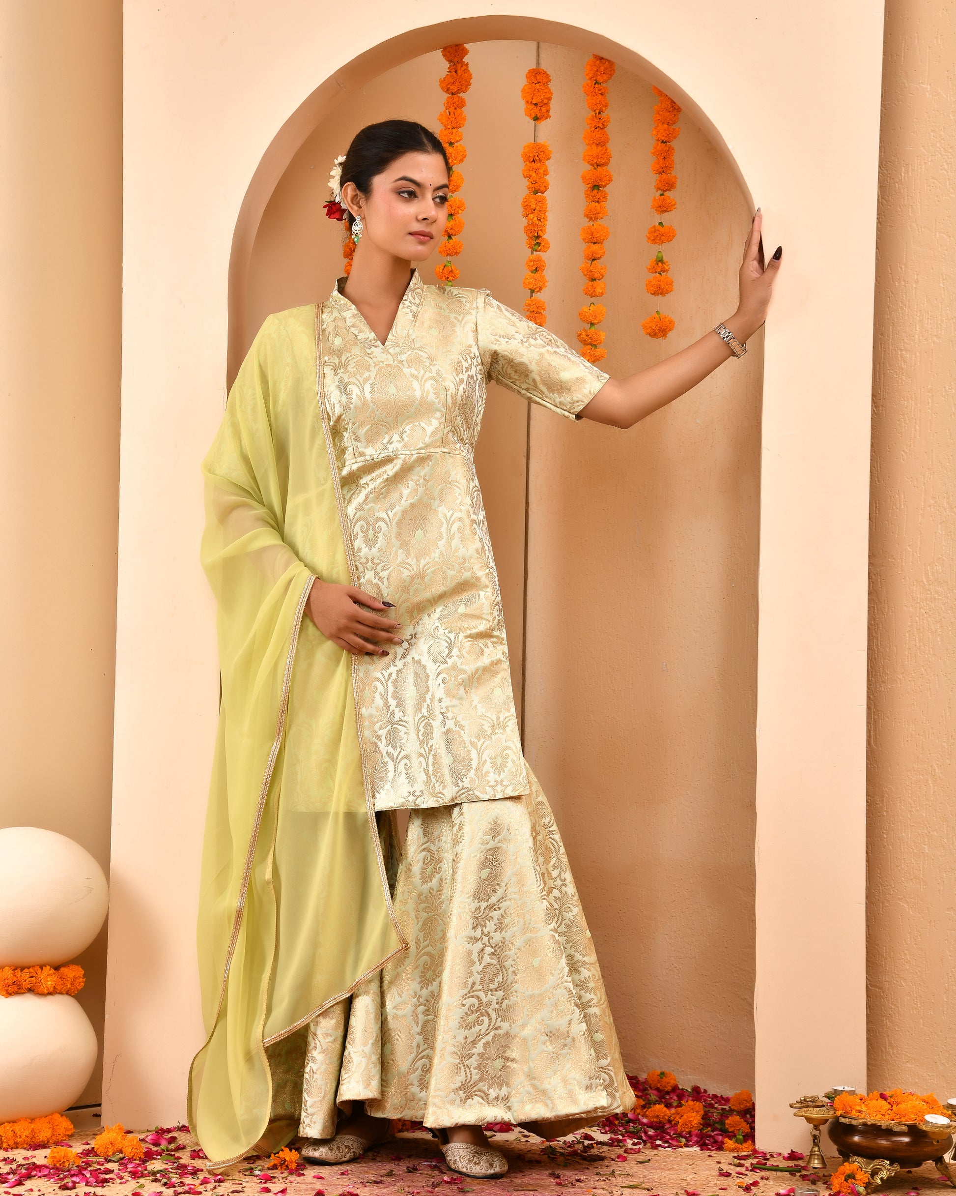 This brocade Sharara set is designed for those who appreciate a blend of classic and contemporary style. A simple yet elegant brocade tunic in a luxurious blue and gold fabric. The fabric showcases a rich, intricate pattern that catches the light beautifully, adding depth and texture without being overly ornate. It has a flattering V-neckline and short sleeves, making it perfect for warm weather or indoor events. The sharara pants are made from the same luxurious brocade fabric and are tailored with a flared cut, giving the outfit a modern, stylish silhouette. This set is ideal for festive occasions, casual gatherings, or semi-formal events. Its simplicity combined with the luxurious fabric and thoughtful design creates a timeless look that is both stylish and comfortable.