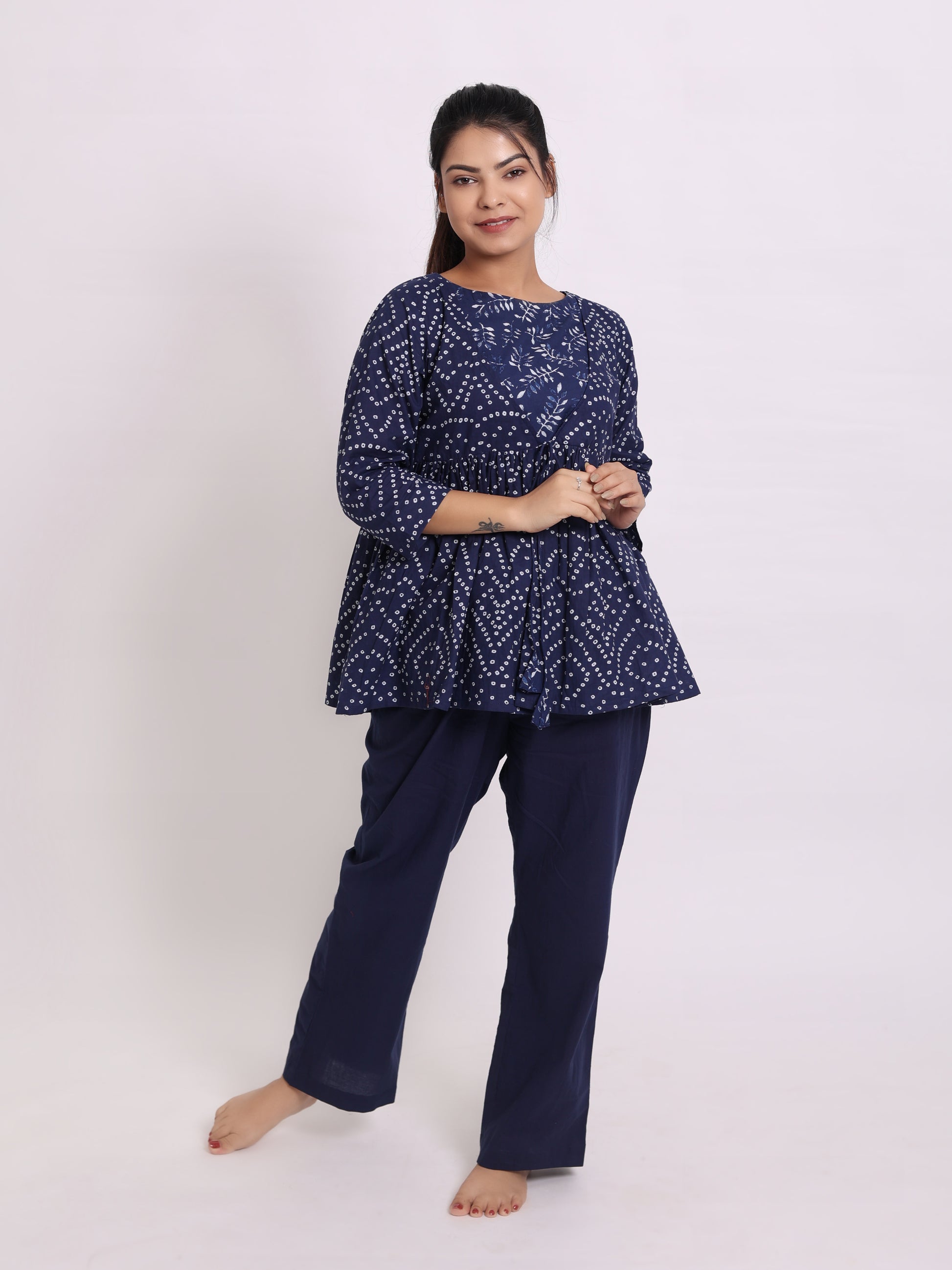 Dresence Loungewear is the way to go, comfortable and stylish. this two-piece set features a top and bottom with a single side pocket and top is a three fourth sleeve, tie up front and empire Aline kurta with flared hem.and the bottom are simple and stylish.