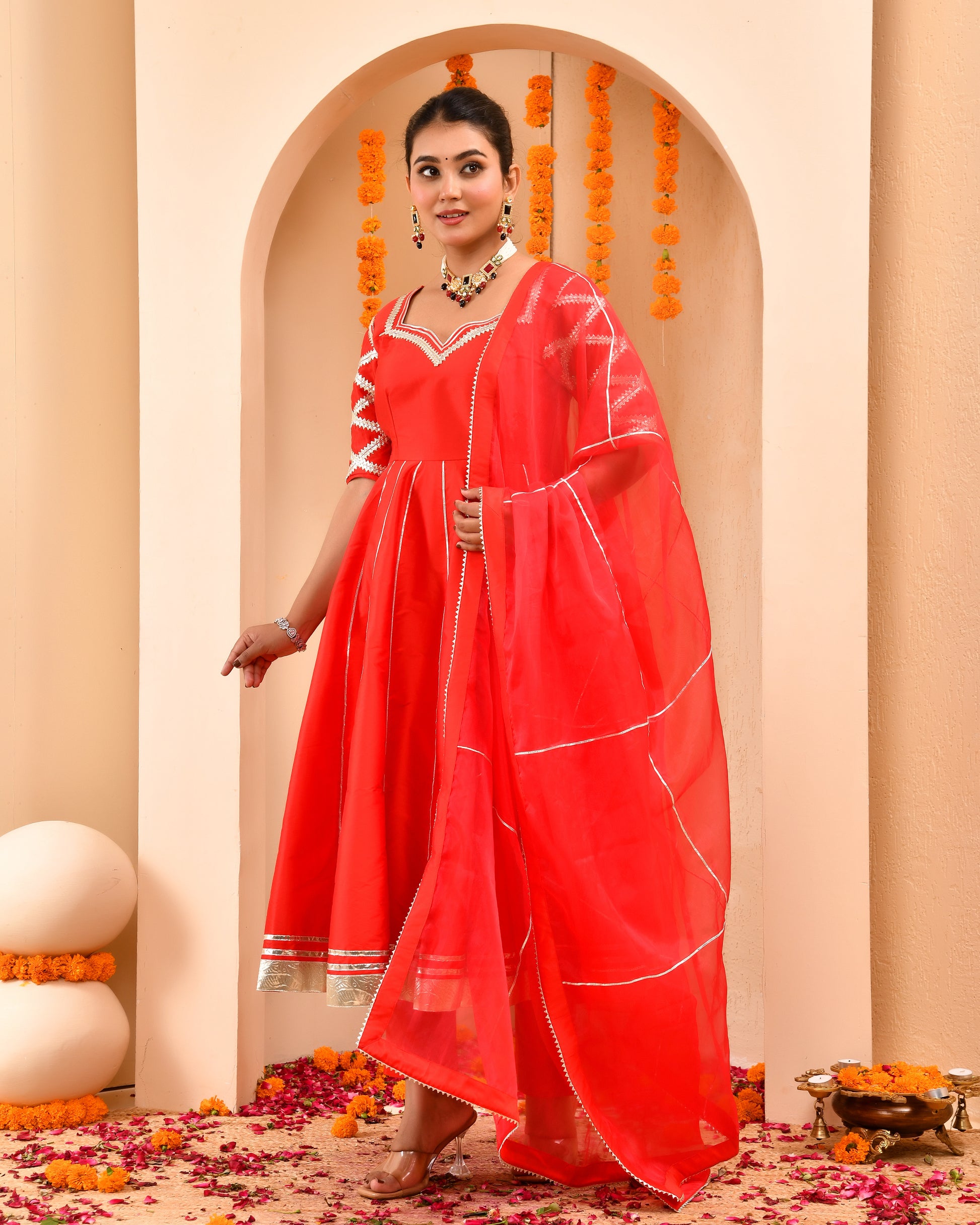 Radiate grace and tradition with this vibrant Saadgi Red Anarkali suit set, crafted to blend timeless elegance with modern charm. The flared silhouette of the Anarkali kurta creates a royal flow, accentuated by a sweetheart neckline and intricately patterned elbow sleeves. Subtle silver lace highlights the hem and dupatta, adding a festive sparkle without overpowering the look.
